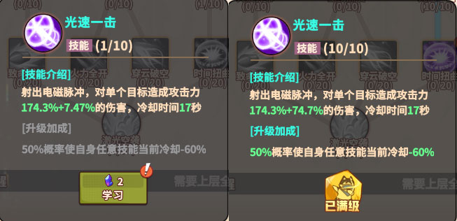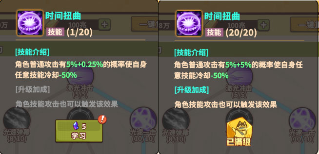 1级时角色普通攻击有5%+0.25%概率使自身任意技能冷却-50%,10级解锁角色技能攻击也可以触发该效果的附加效果,随着升级每级触发的概率增加0.25%,满级技能有5%+5%概率使自身任意技能冷却-50%