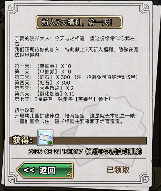 开服前 7 天,是您最需要 “帮助” 的阶段 —— 所以我们每天都会往您邮箱里放一份新人礼,帮您慢慢适应、稳稳积累: