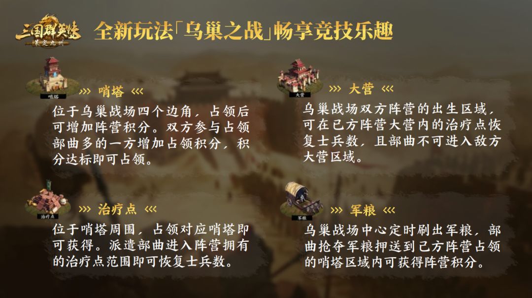 ●全新玩法【乌巢之战】:S3赛季开启18天左右正式开启,3v3限时竞技,占哨塔、运军粮、语音开黑,无联盟限制畅快对战!