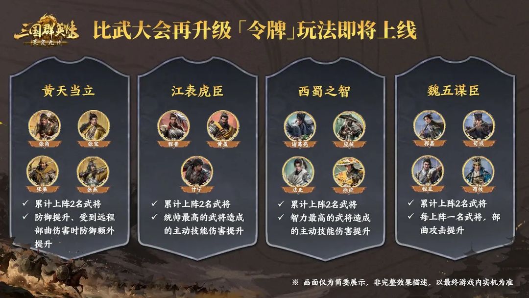 比武大会新增「令牌」玩法,组队策略性翻倍,解锁指定武将组合即可激活强力加成,以下是羁绊介绍哦~