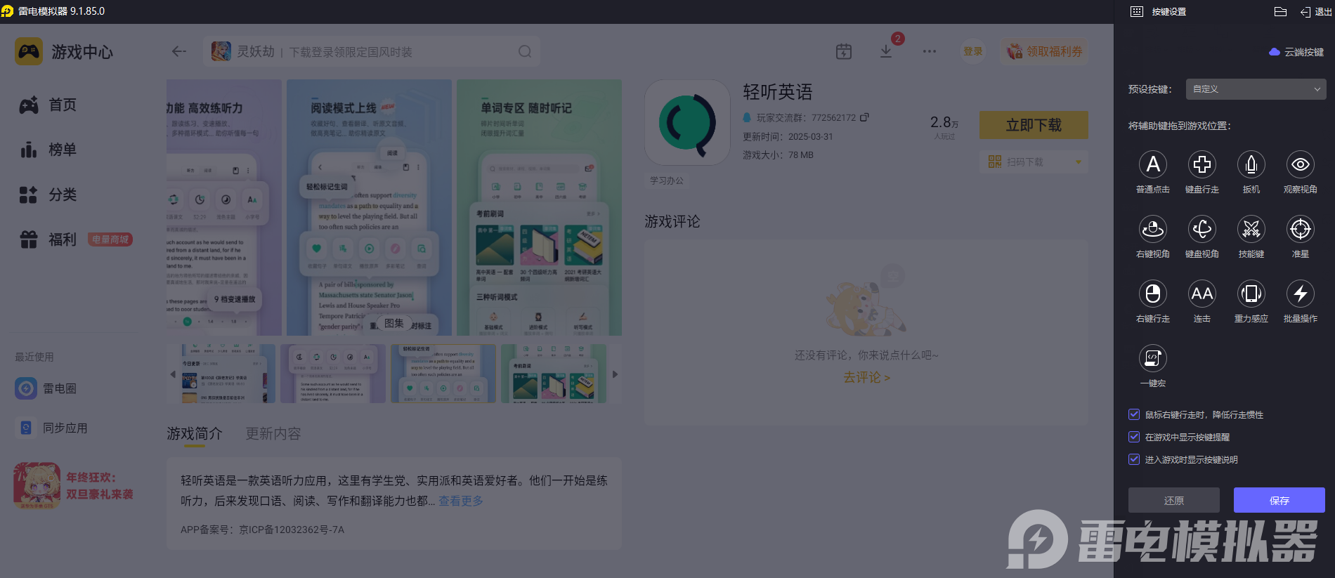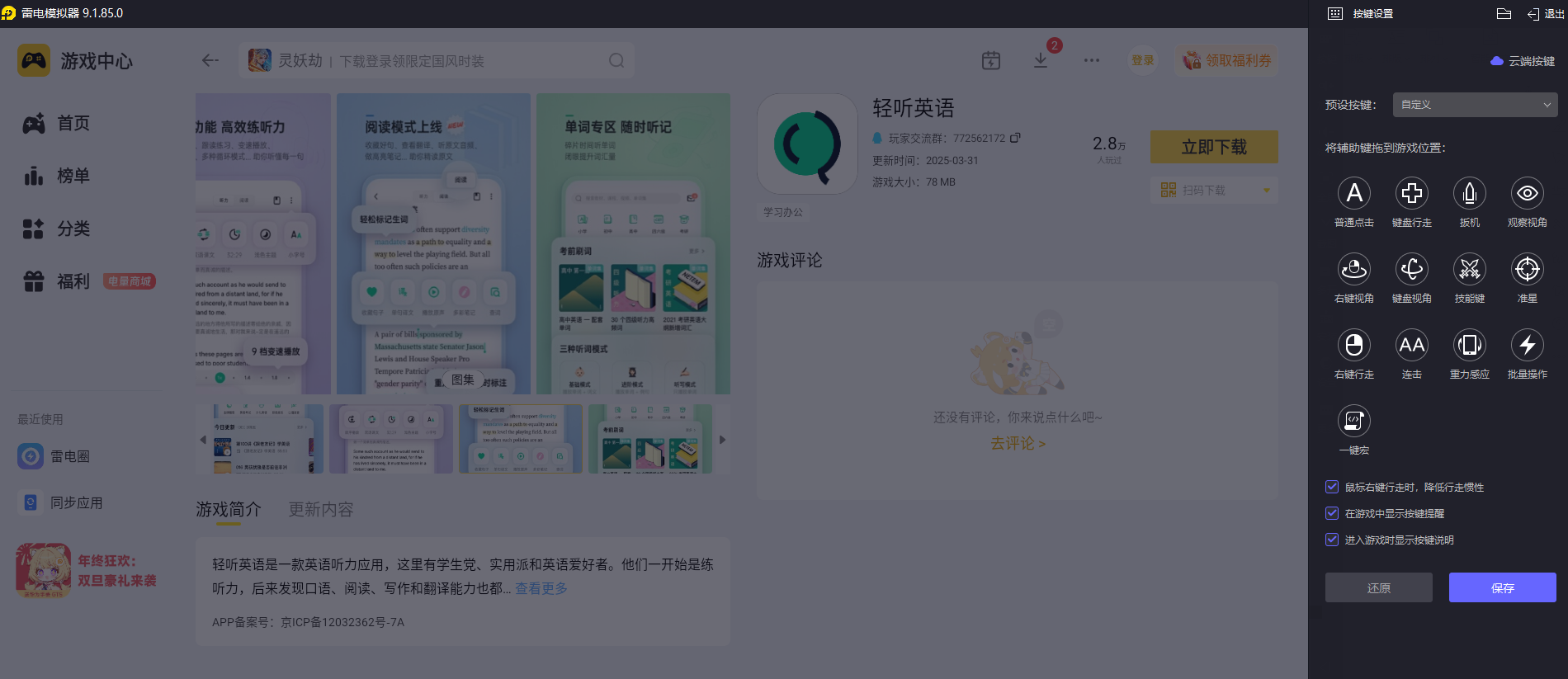 操作方面,雷电模拟器让轻听英语的使用更省心。它支持键鼠映射功能,能根据自己的习惯设置快捷键,比如用键盘控制播放、暂停、切换句子,鼠标点击就能查询单词,响应延迟很低,不会有误触情况。
