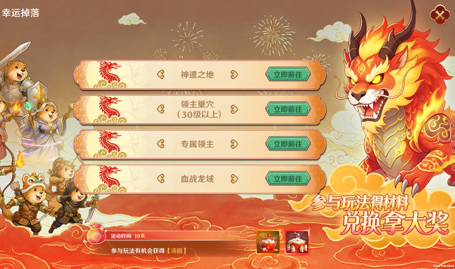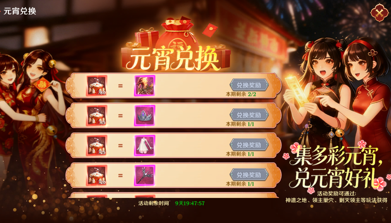 活动期间,参与游戏内指定玩法,就有机会随机掉落【酒酿圆子】和【豆沙元宵】,无需额外肝活、无门槛参与,集齐兑换材料,可前往元宵兑换界面,兑换各类限定豪礼,解锁更多元宵专属惊喜,错过真的亏大啦