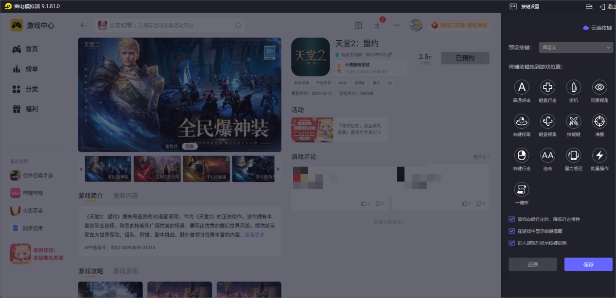 针对天堂2盟约手游的复杂操作,雷电模拟器提供智能匹配手机端键位功能。无论是技能释放、移动走位,还是背包管理,都能通过键盘与鼠标精准操控,告别手机端误触与操作延迟,让战斗更加得心应手。