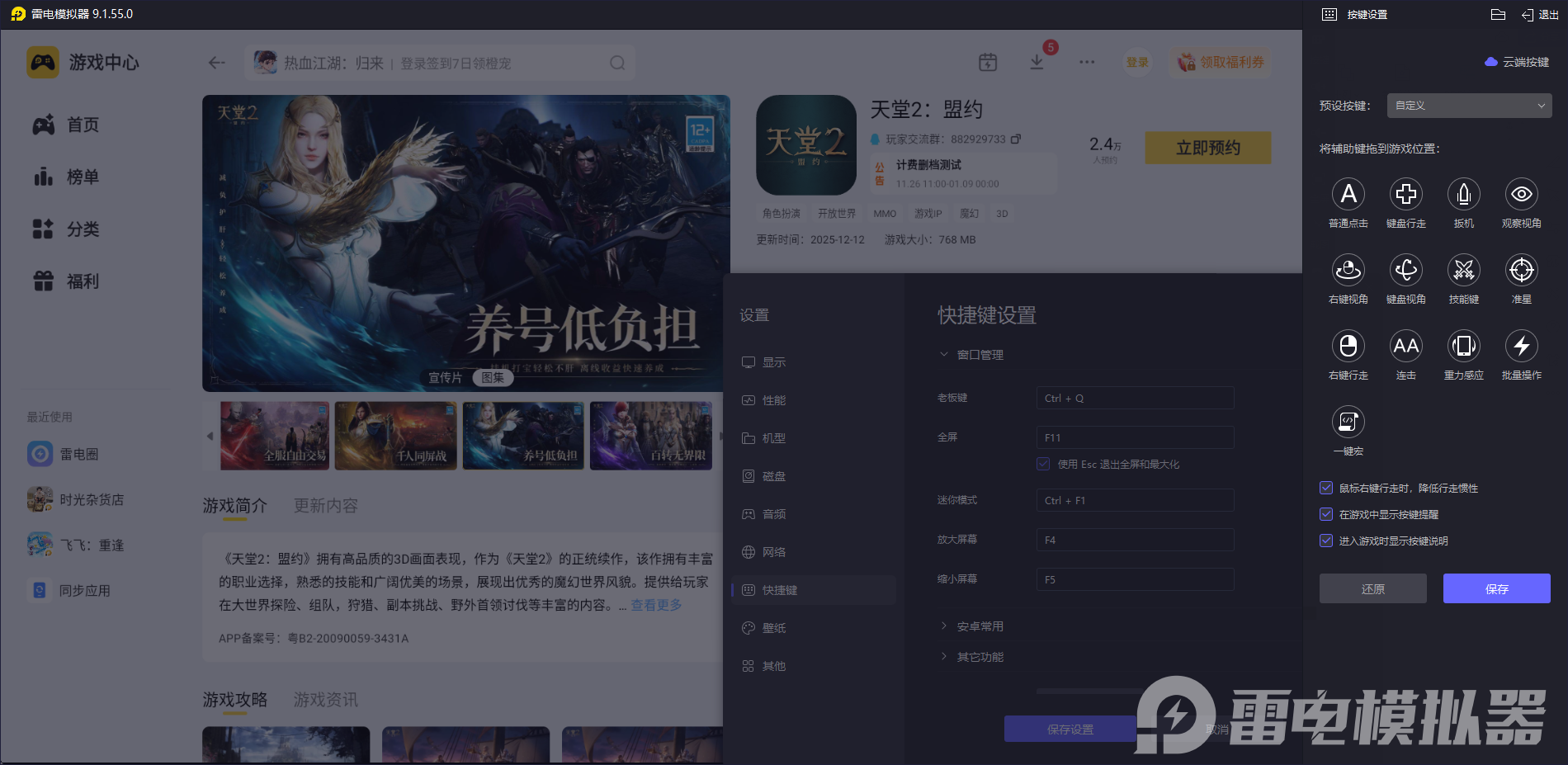 雷电模拟器的操作设置能让游戏体验更顺畅。它支持键盘鼠标映射,玩家可以自定义技能按键位置,释放技能时只需按对应键盘按键,反应更快更精准。在组队团战或攻城战中,鼠标控制视角转动更灵活,走位也能更细腻,避免了手机触屏操作可能出现的误触问题,让玩家能更从容地应对各种战斗场景。