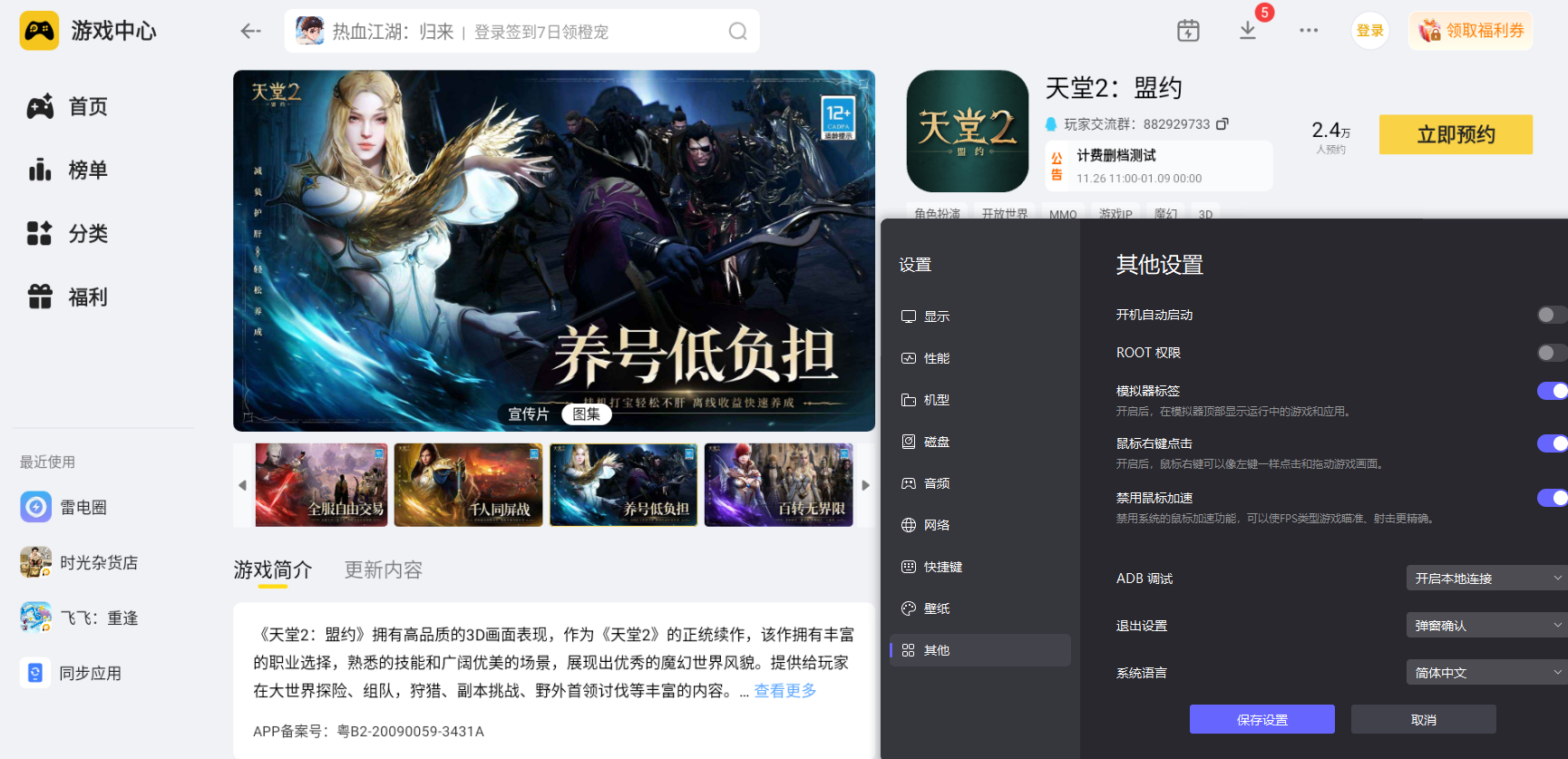 用雷电模拟器玩《天堂2盟约》,画面体验会有明显提升。模拟器能设置4K分辨率,让游戏中的艾尔摩大陆场景细节更清楚,无论是森林的植被还是城堡的砖石纹理都能清晰呈现。同时,模拟器还能优化光影特效表现,技能释放时的光芒、动态天气的变化都更流畅,沉浸式感受更足。