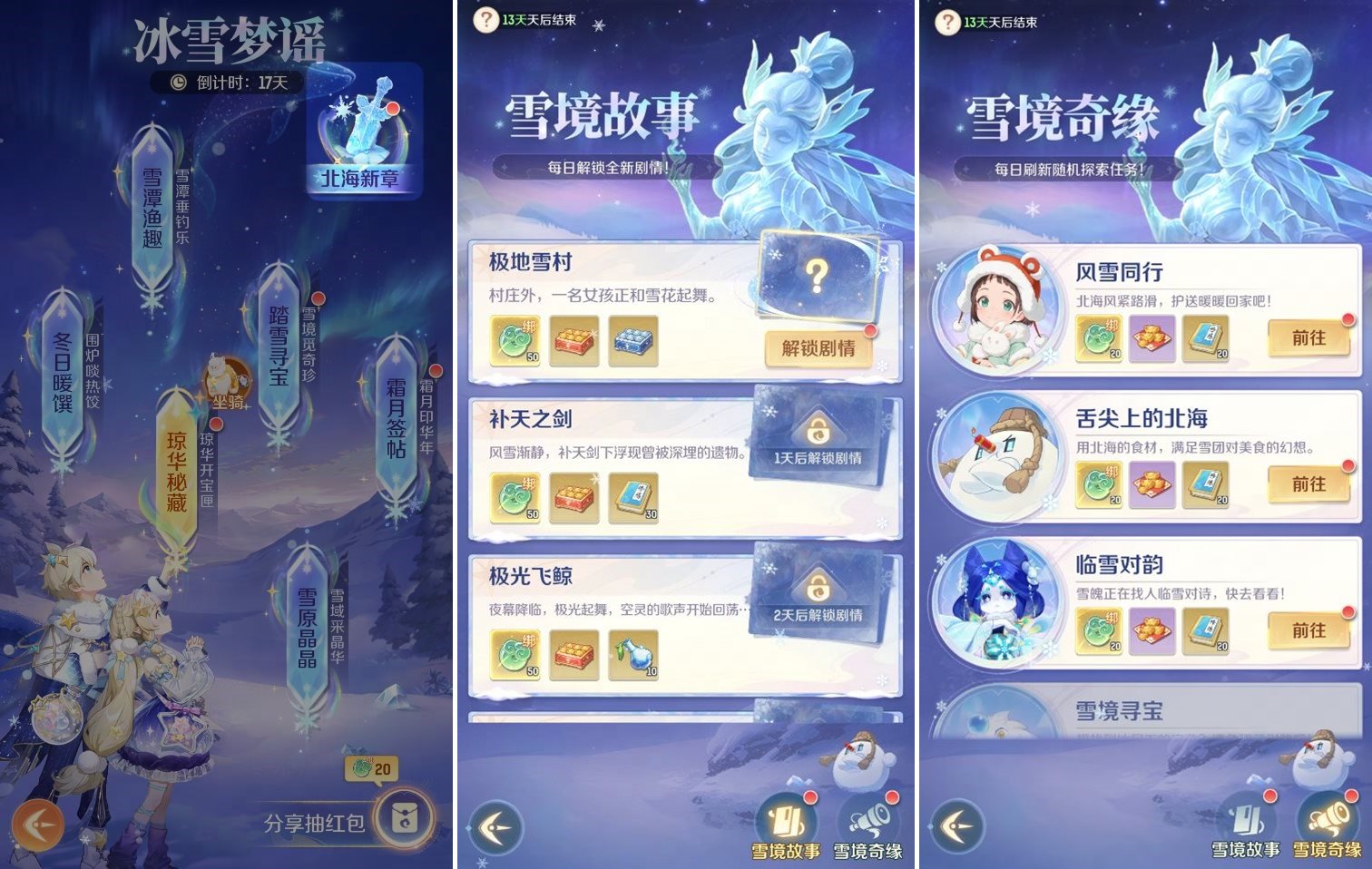 还有每日随机刷新、可供探索的【雪境奇缘】,了解北海秘闻!