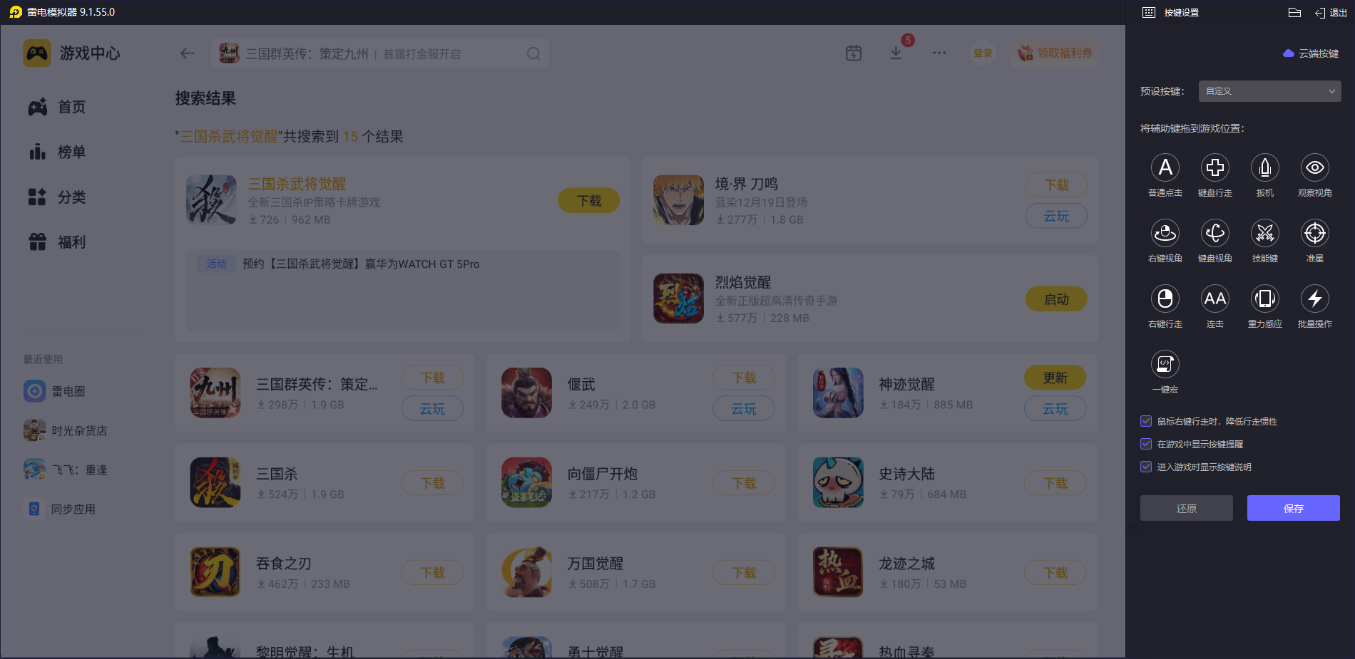 大家可以用雷电模拟器玩《三国杀武将觉醒》,能让赵云的战力发挥更上一层楼,核心优势集中在操作和画面两方面。操作上,模拟器支持键盘映射,可自定义技能按键,赵云的“冲阵”技能需要精准瞄准敌方列位,键盘按键能让释放更及时,搭配“龙胆”的攻防转换时,按键反馈更快,不会出现手机触屏误触的情况,让赵云在团战中七进七出更灵活。