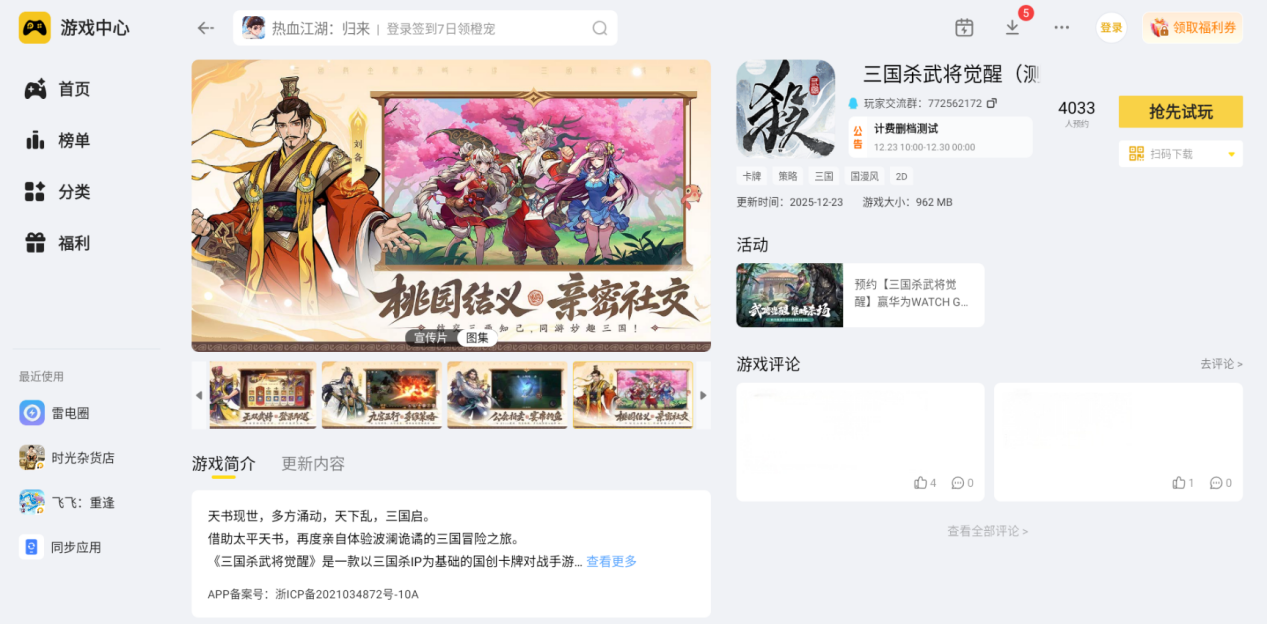 三国杀武将觉醒周瑜以超强的群体爆发、灵活的策略适配,成为游戏中不可多得的全能输出将,无论是新手开荒还是老玩家冲榜,都能凭借他的技能优势轻松破局。如果你也想体验“羽扇纶巾,谈笑间樯橹灰飞烟灭”的快感,不妨用雷电模拟器操控周瑜,在三国战场中书写属于你的智略传奇。