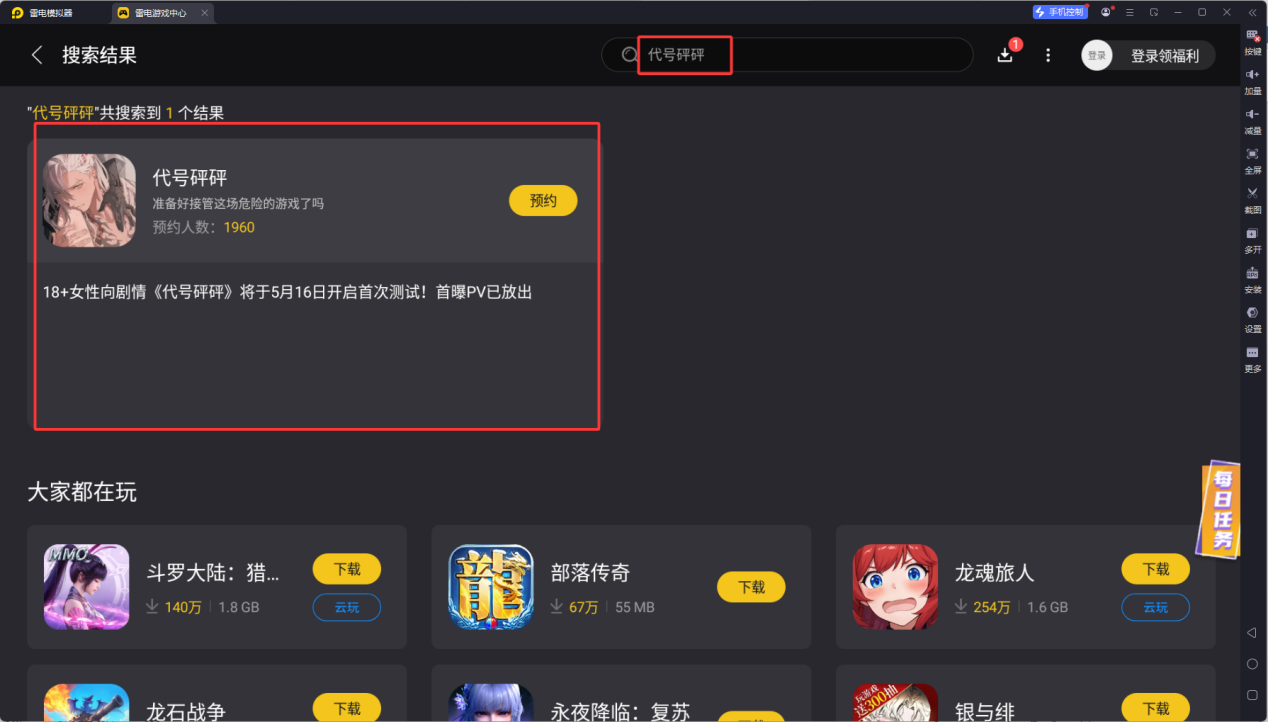 下载并安装雷电模拟器后,启动软件并进入内置的“雷电游戏中心”。在搜索栏输入“代号砰砰”,游戏仍处于预约阶段,系统会显示“预约”按钮,点击后即可锁定测试资格,待公测开启时将自动安装并发放预约奖励。