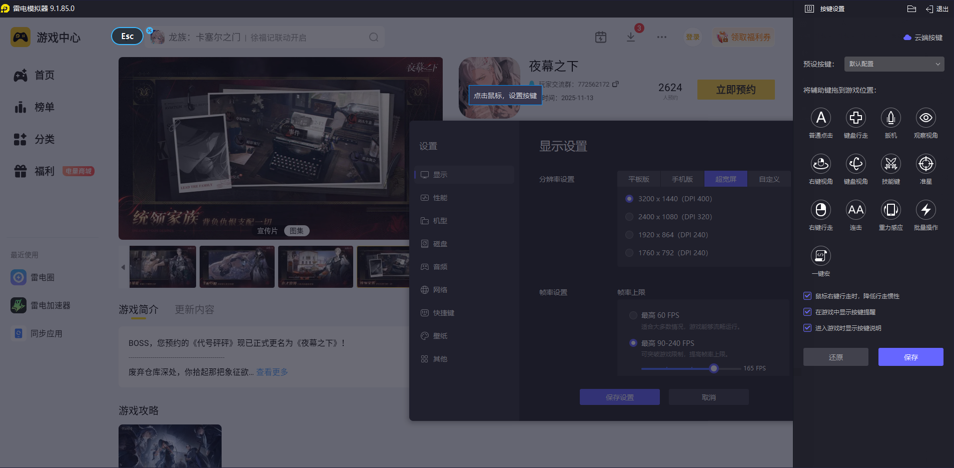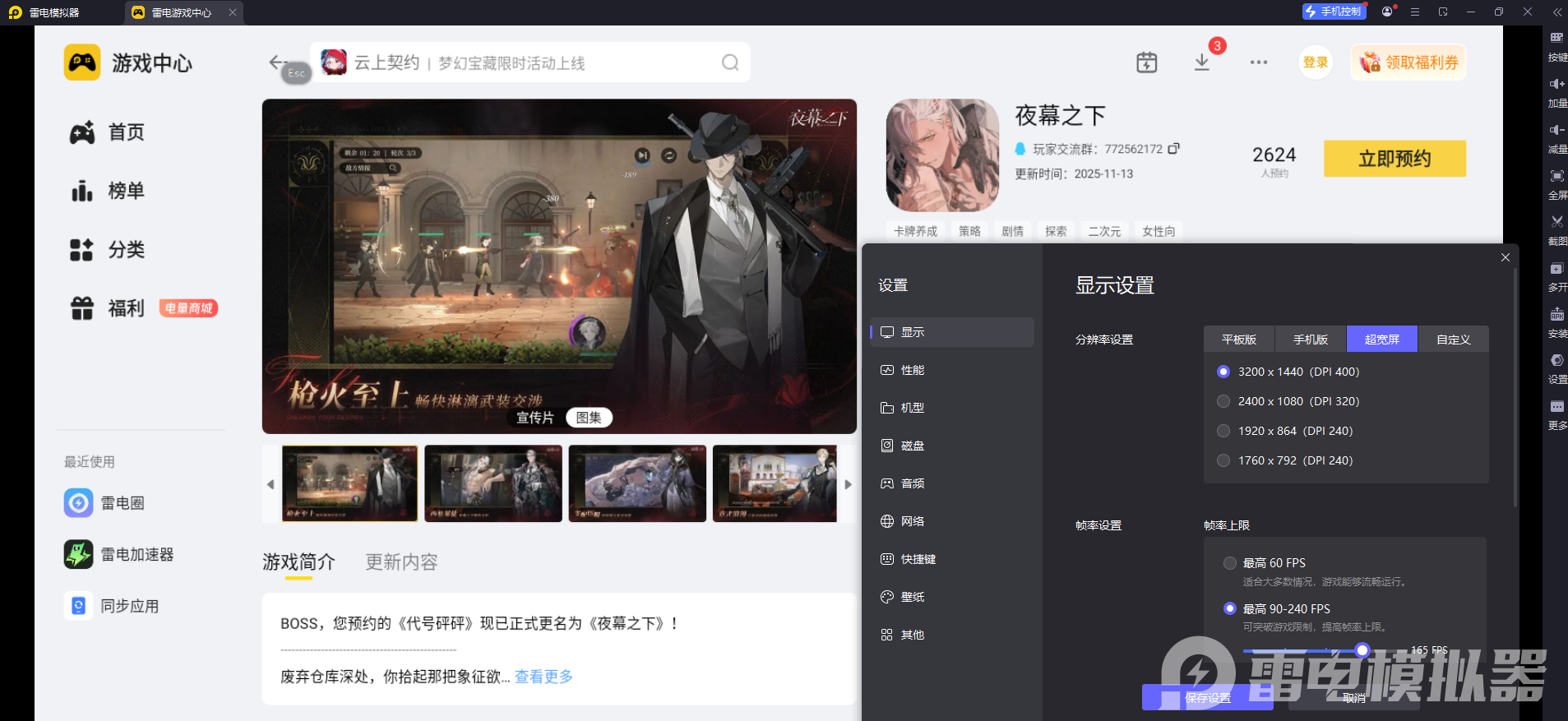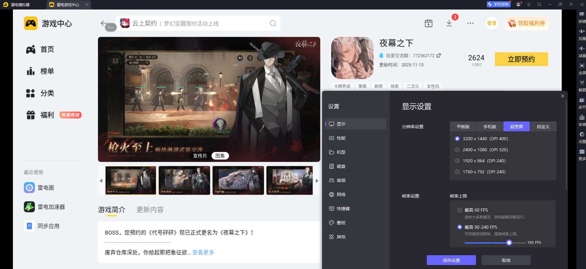《夜幕之下》的支线场景丰富,有昏暗的仓库、繁华的夜间街道等,很多细节藏着任务线索。雷电模拟器支持4K分辨率和165稳定帧率模式,能让支线场景的细节更清晰,比如染血手套的纹理、角色表情的变化都能看清。大屏显示还能让悬疑支线的线索查找更方便,高帧率让巷战等动作场景更丝滑,提升支线任务的沉浸感。