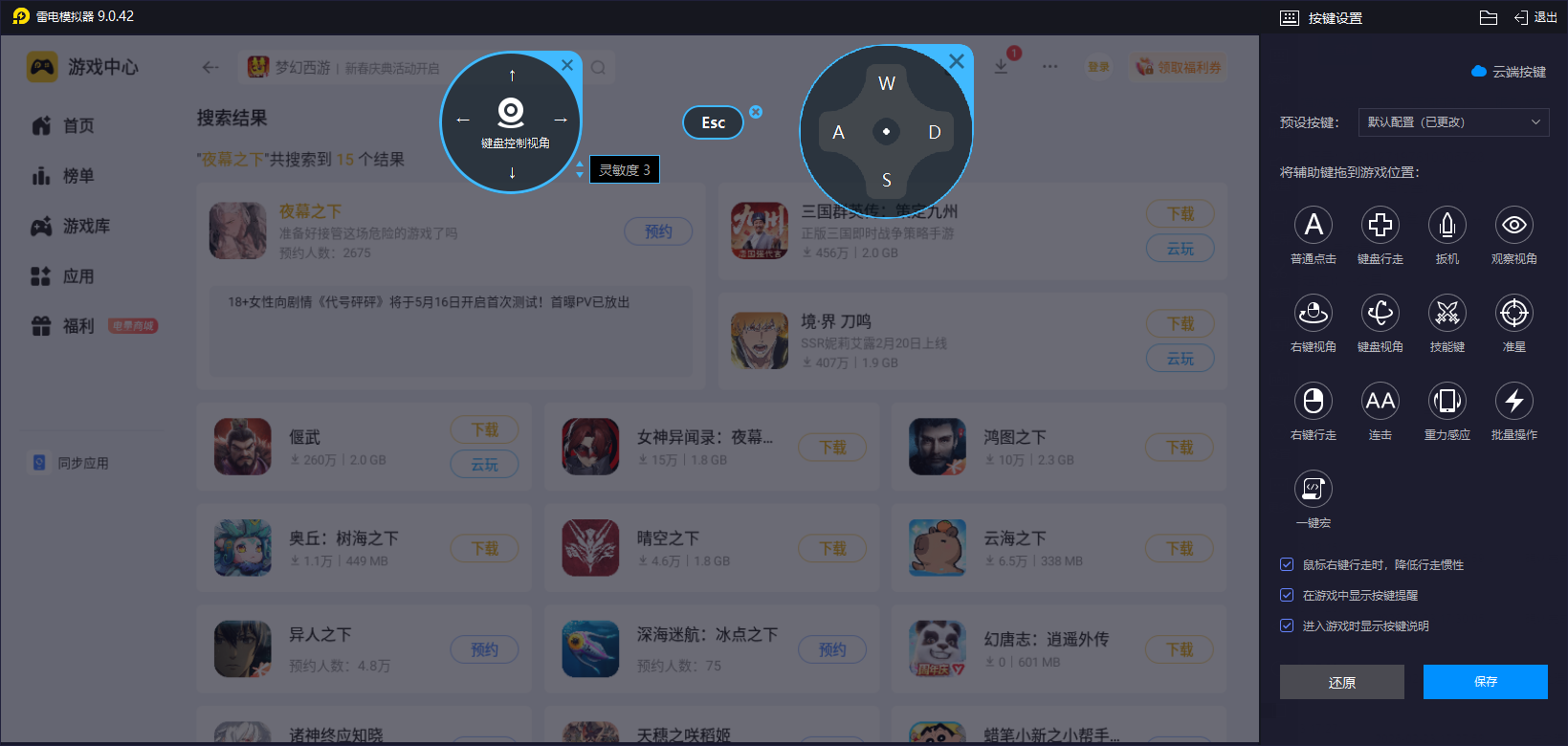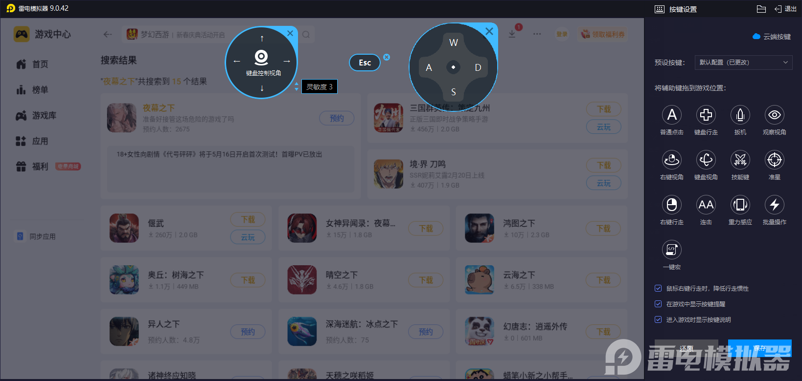 雷电模拟器支持键盘、鼠标的自定义按键映射,玩家可根据夜行者的技能释放逻辑,为每个角色的核心技能设置独立快捷键,避免手机触屏操作中因误触、滑动失误导致的技能释放错误问题,尤其在高难度副本中,能精准把控技能的释放时机,打出完美操作。