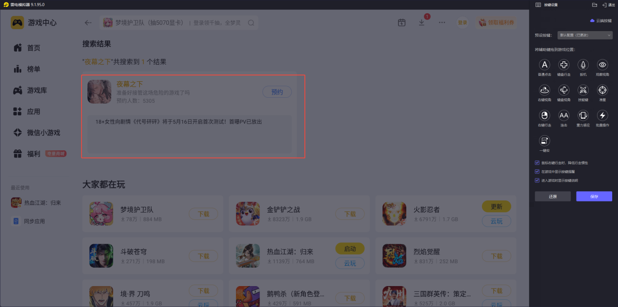 夜幕之下是一款自带暗黑权谋质感的女性向手游,凭借独特的黑帮复仇题材和沉浸式剧情,早早收获了百万预约量,很多玩家翘首以盼,反复追问夜幕之下什么时候公测。截至目前,游戏刚完成新一轮限号计费删档测试,后续夜幕之下什么时候公测尚未公布官方确切日期,想提前适配流畅体验,推荐雷电模拟器,等开服后直接解锁最优游玩状态。