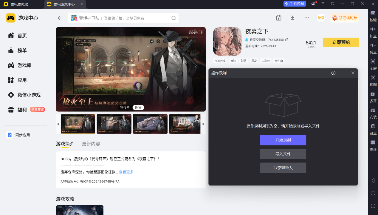 雷电模拟器自带的操作录制功能,适配游戏中诸如市井焦土等副本的日常刷取需求。开启该功能后,可录制一次完整的通关流程,之后就能自动重复执行,不用手动重复操作,适合日常积累潮生结晶。针对副本的固定战斗流程,录制好通关步骤后,可自动完成刷本任务,解放双手,高效完成每日材料收集。不用长时间盯着屏幕操作,兼顾游戏养成与日常事务,让资源积累更轻松省心。