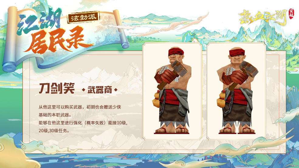 职能: 装备强化的起点! 提供武器、防具的修理、购买、强化服务。是玩家获得第一把像样武器、学会强化装备技巧的导师。前期许多任务需要他打造的兵器或修复的装备。