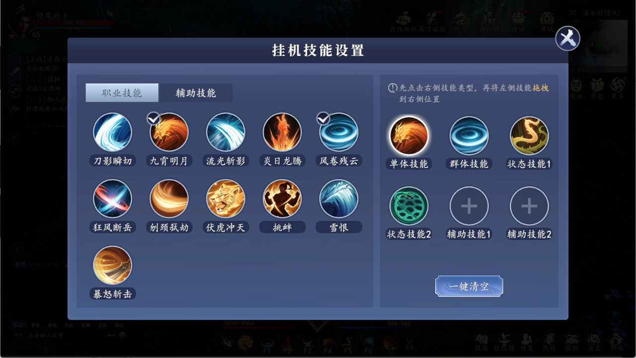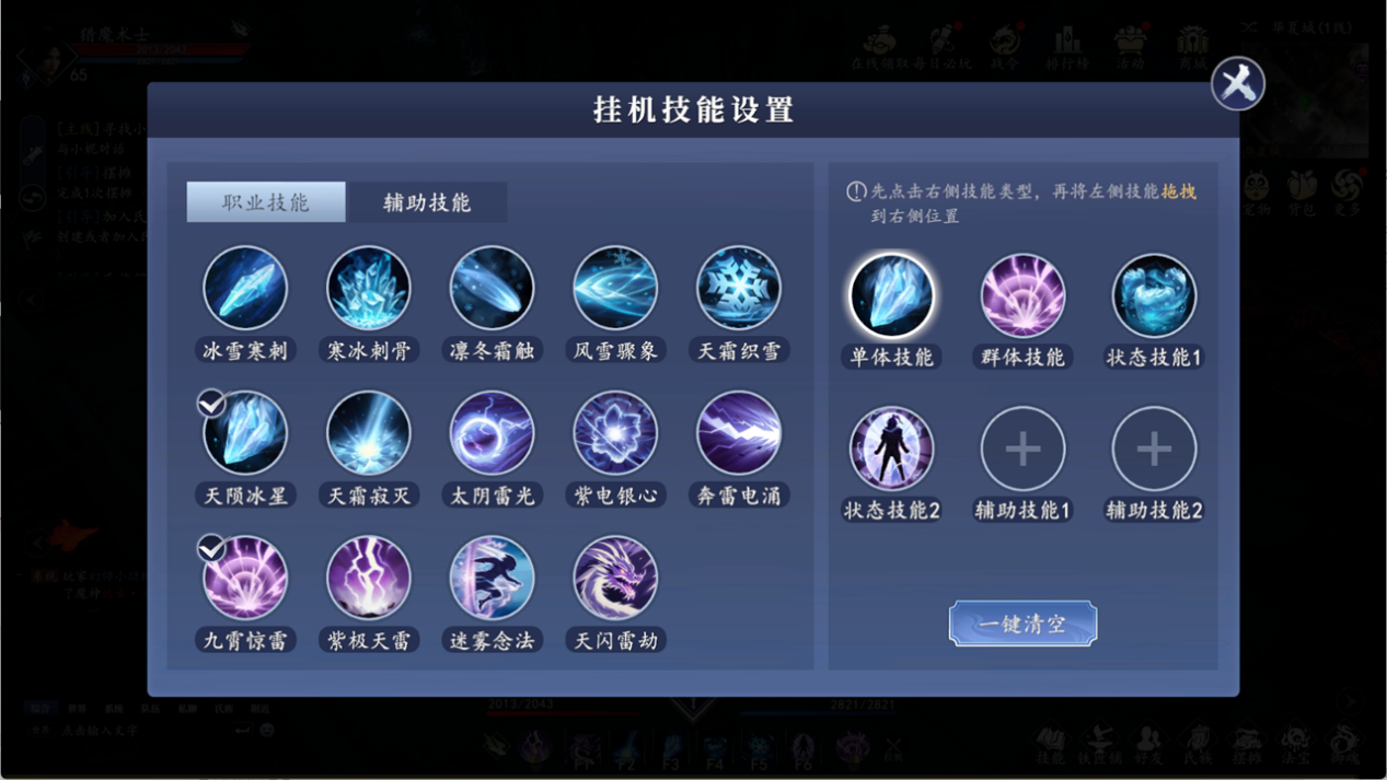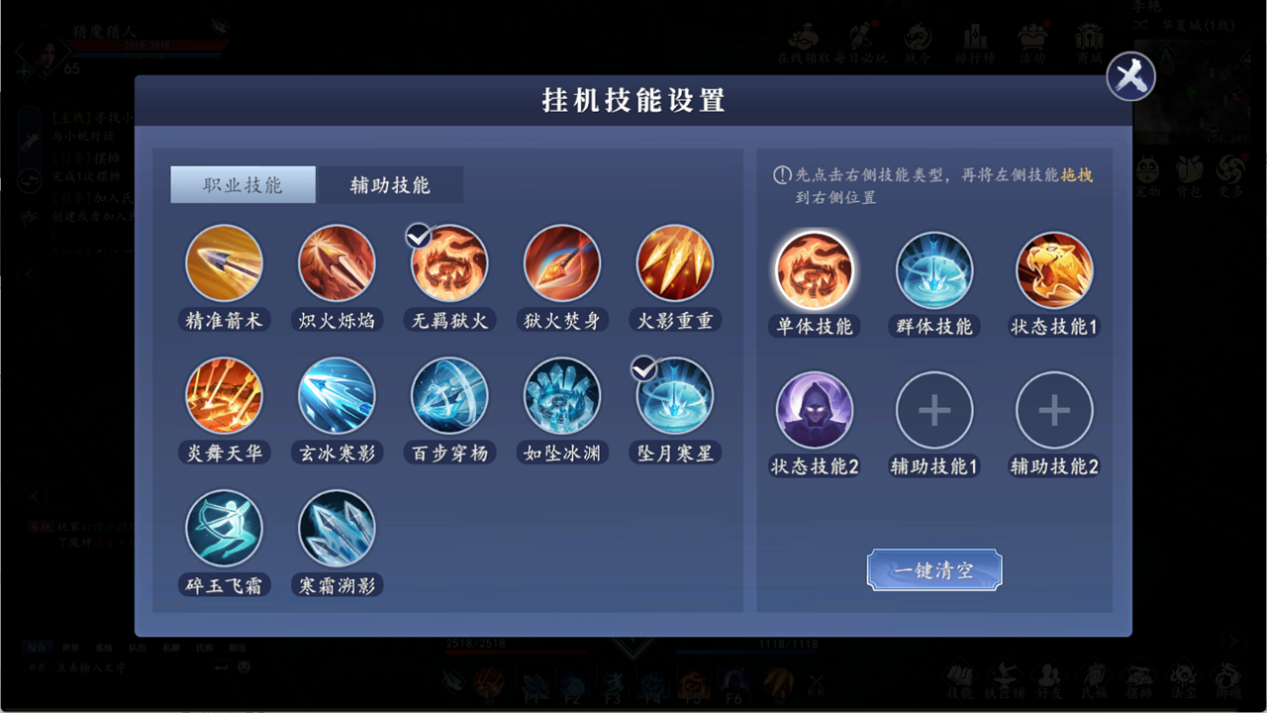 挂机设置,游戏上线有在线挂机和离线挂机。注意:不放技能点挂机的话 是平A,所以一定要设置好挂机技能: