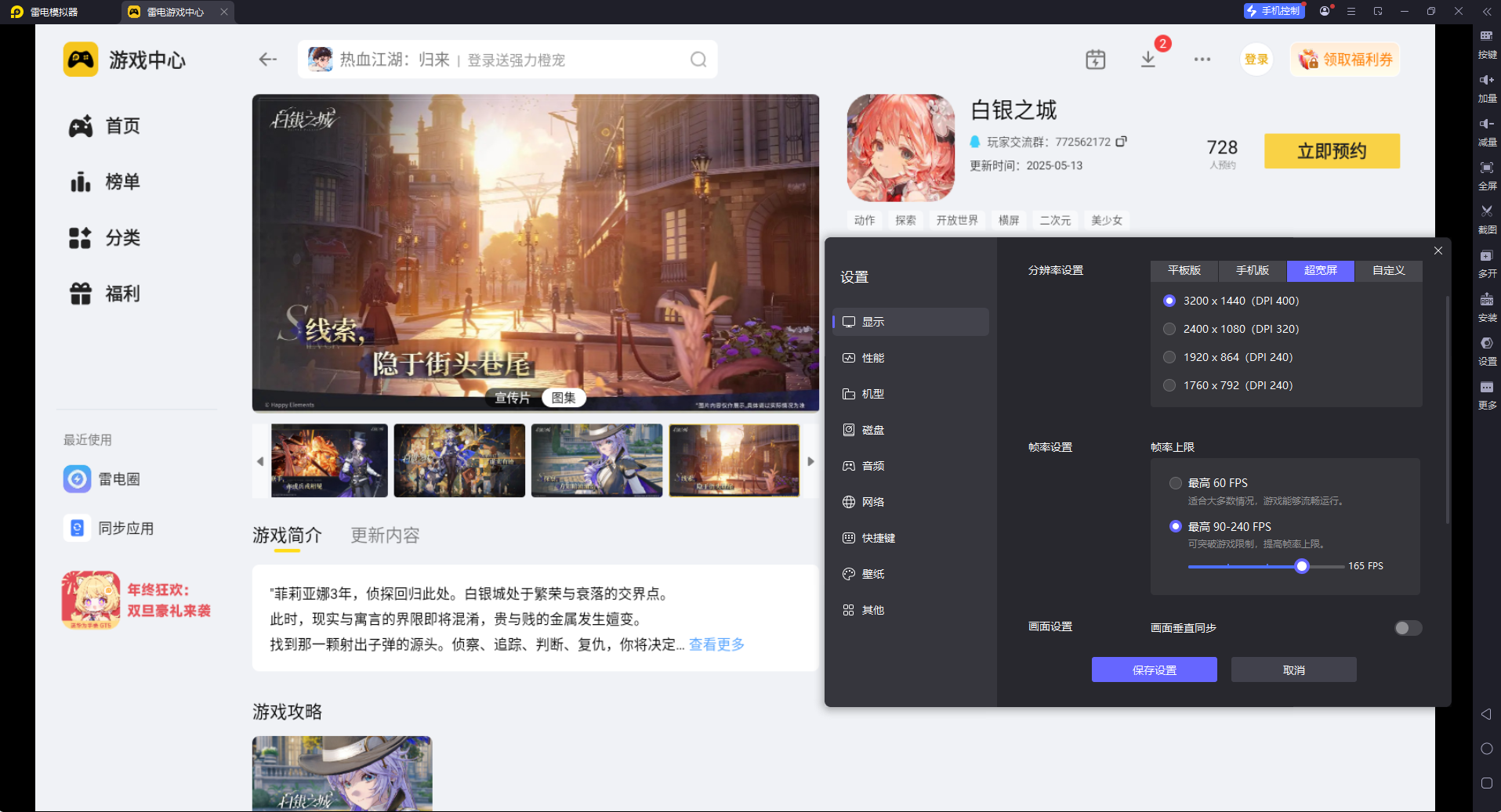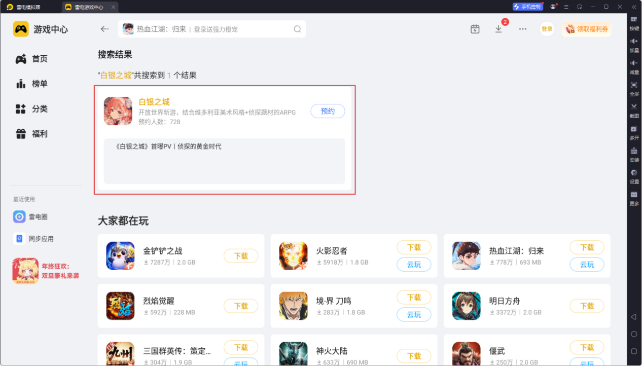 《白银之城》有虚幻5极致光影、侦探探索、动作战斗等特色,雷电模拟器刚好能匹配这些需求。大家打开浏览器搜索“雷电模拟器”官网,下载安装后,在模拟器的雷丹中心里搜索《白银之城》,点击预约即可。