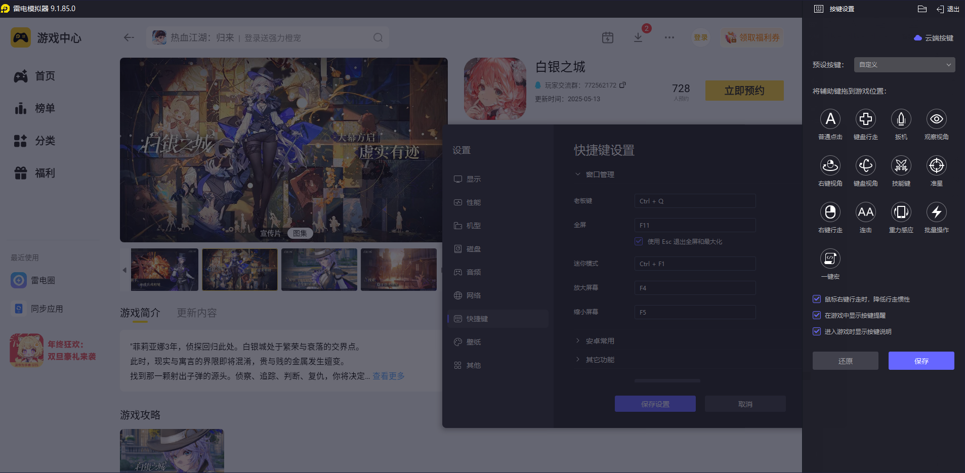 《白银之城》有钩锁移动、振刀弹反、QTE处决等操作,雷电模拟器能自定义键盘映射。玩家可以根据自己的习惯设置按键,不管是探索时快速切换视角找线索,还是战斗时衔接近战、远程连招,按键响应都很及时,不会出现卡顿或误触,操作起来比手机更灵活。