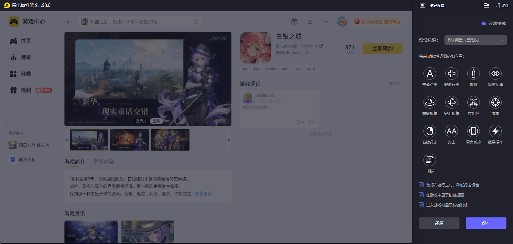 雷电模拟器具备智能匹配手机端键位的功能,玩家可以根据自己的操作习惯,自定义键盘和鼠标按键。在挑战白银之城灰姑娘时,通过合理设置键位,能够实现精准的移动、闪避和攻击操作,如同在手机上操作一样得心应手,大大提升战斗的竞技手感,增加获胜的几率。