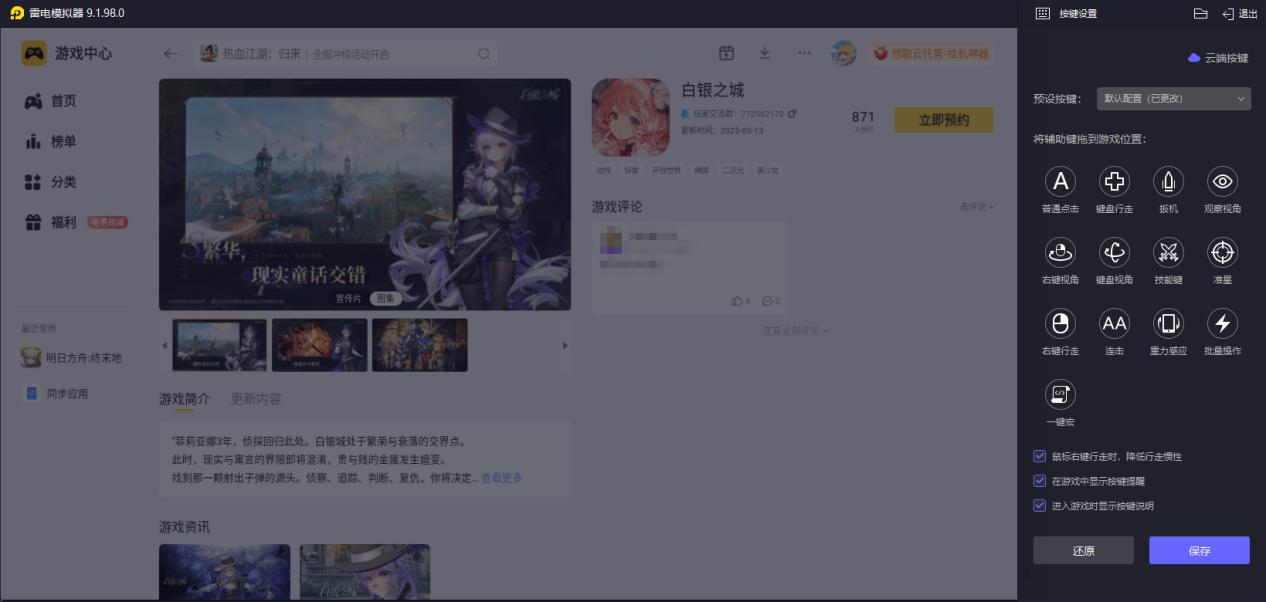 雷电模拟器具有智能匹配手机端键位的功能,为玩家带来出色的竞技手感。在白银之城中,劳伦的战斗需要精准的操作,闪避、释放护盾等时机都至关重要。雷电模拟器支持键盘、鼠标甚至手柄操作,玩家可以根据自己的习惯进行键位自定义,还能通过宏指令实现连招一键触发,操作延迟低于5ms。比如在使用劳伦进行战斗时,玩家可以轻松地通过键盘和鼠标完成复杂的操作,精准地抓住闪避和反击的时机,让劳伦在战斗中发挥出最大的实力。