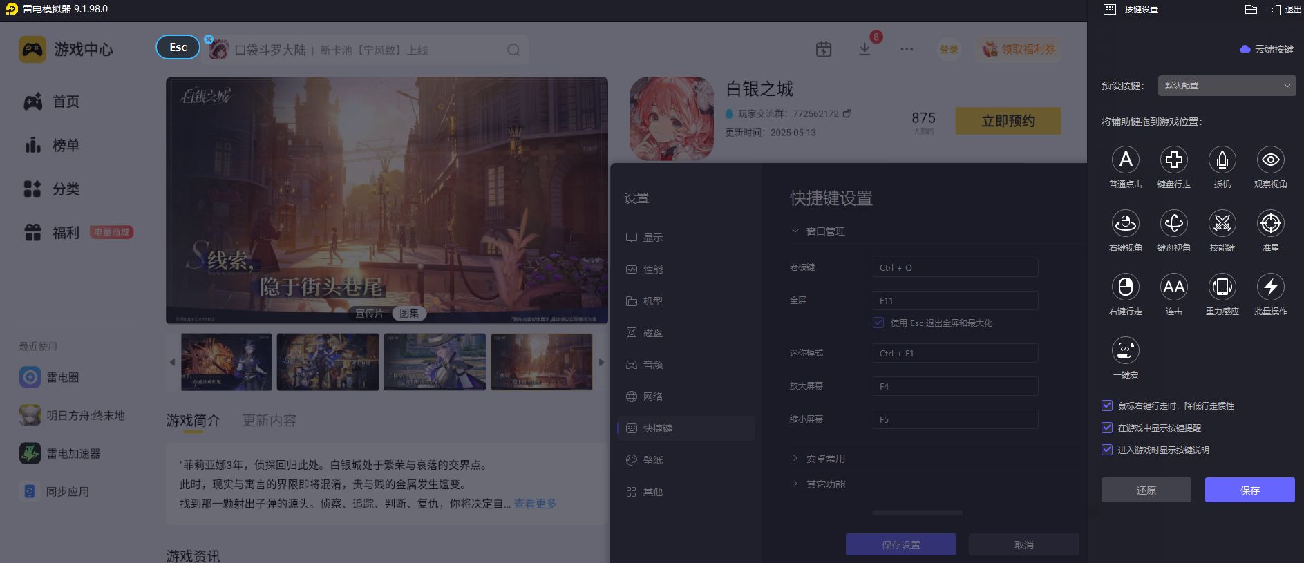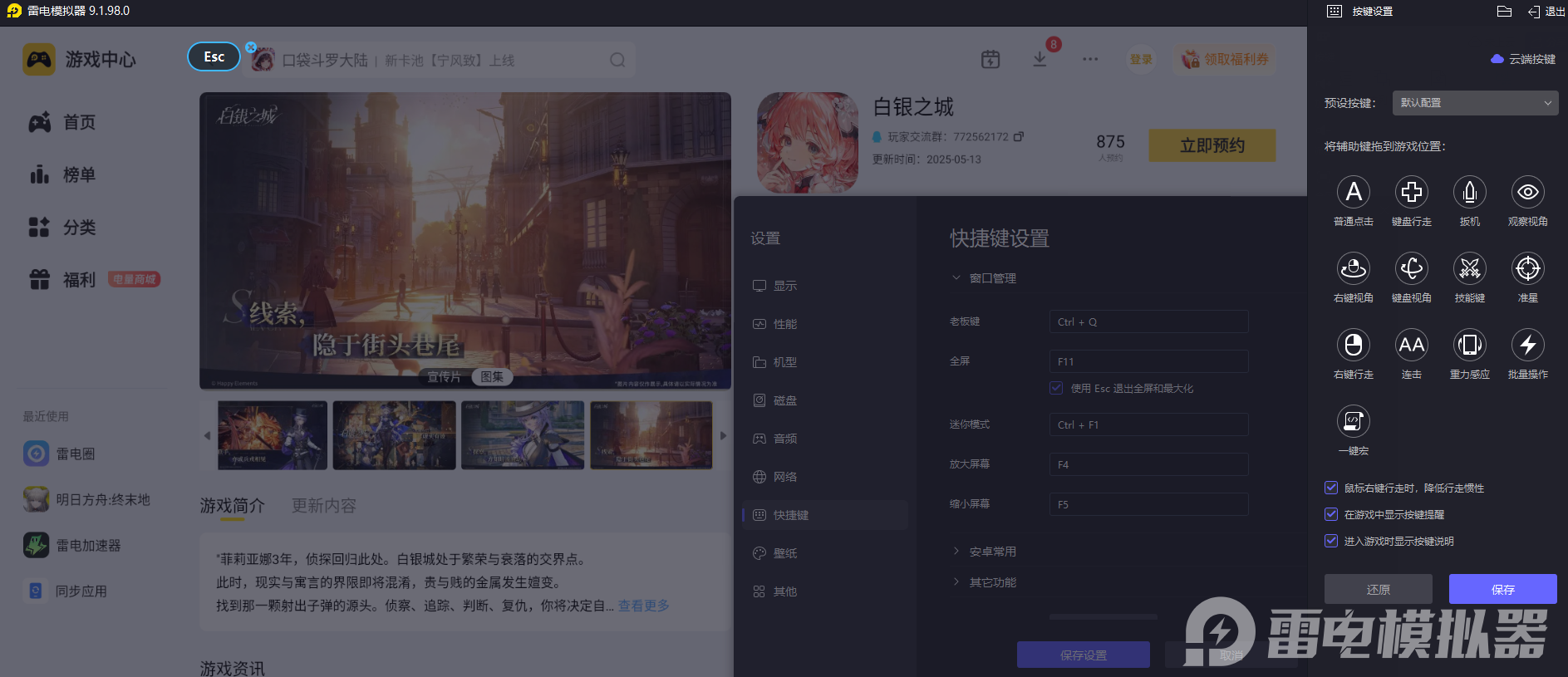使用雷电模拟器玩《白银之城》,可自定义键鼠映射按键,将技能释放、任务交互等常用操作设置为快捷键,操作响应无延迟。刷声望任务时,精准的键鼠操控能让你快速完成战斗、采集等操作,无需反复适应触屏,尤其在多任务连续执行时,能节省大量时间,让声望积累效率翻倍。