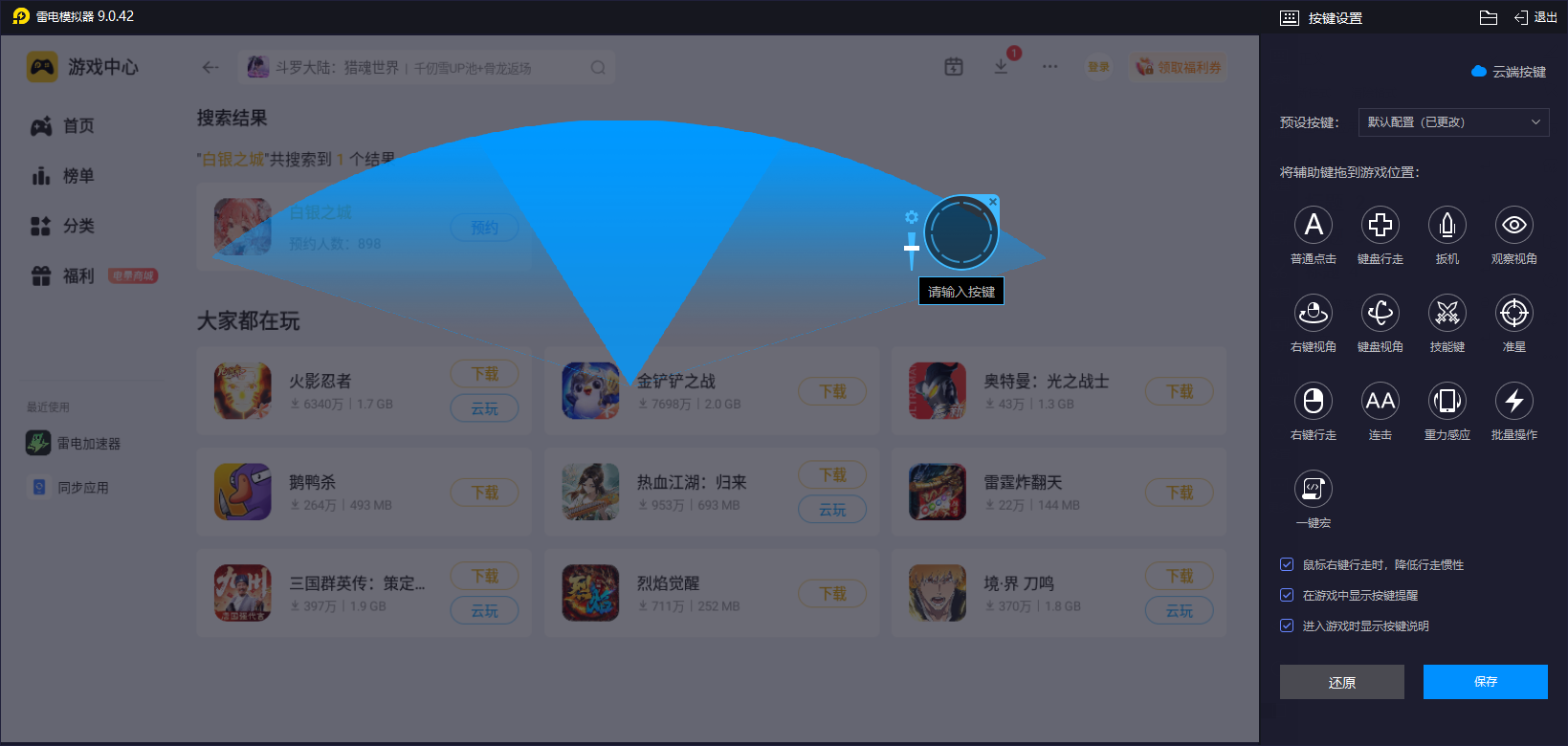 对于《白银之城》中的侦探解谜环节,玩家可去利用键盘快捷键快速打开地图、查看线索笔记,在小队战斗中,通过鼠标精准控制角色走位,躲避BOSS技能,同时用键盘按键无缝切换不同角色,释放技能连招,实现更复杂、更高效的操作,而且不用再担心会有手机操作带来的误触问题,雷电模拟器更是可以让玩家去预设多种不同的方案保存,这样就能在使用的时候直接去选择。