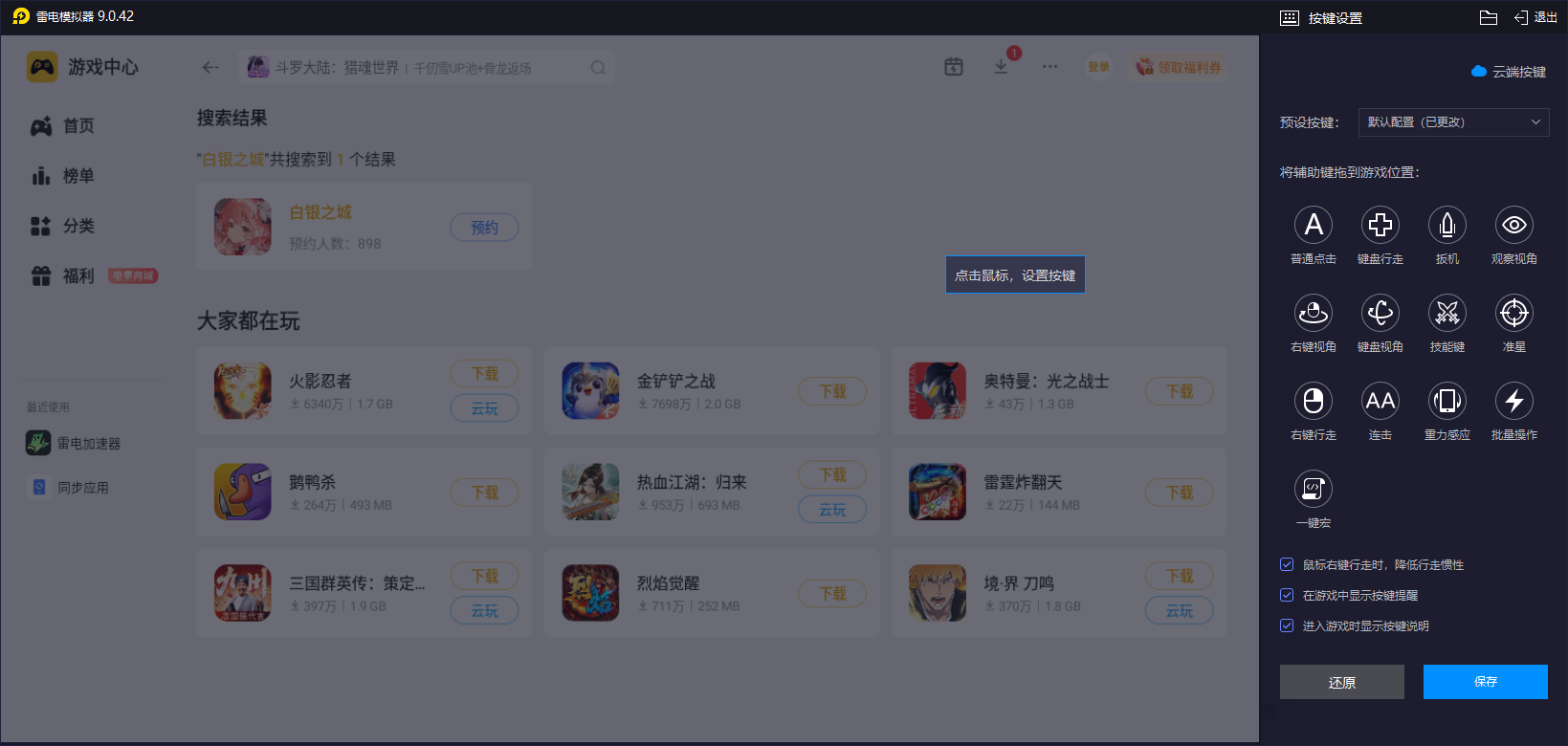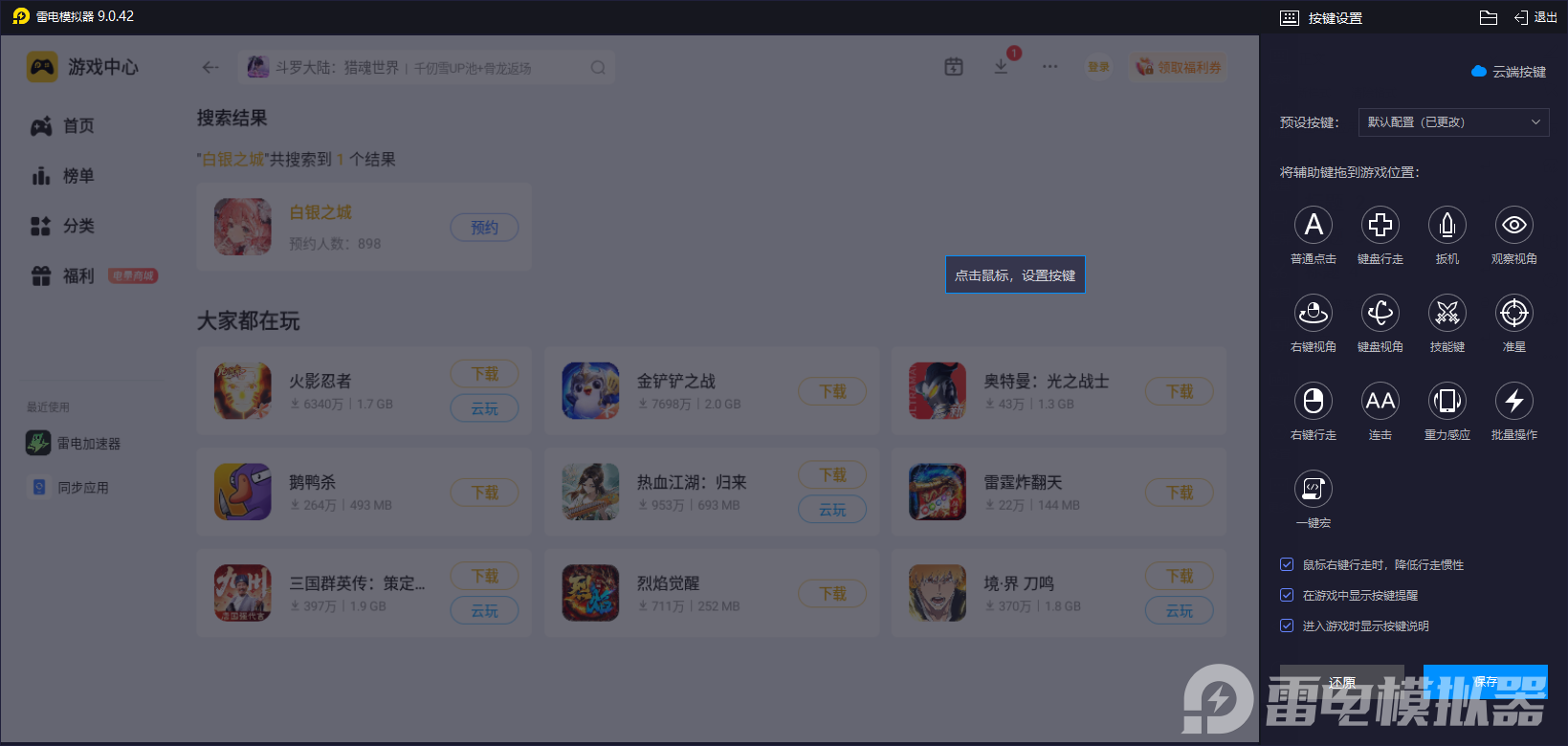 键鼠自定义方面,雷电模拟器提供了超过数百种预设键位方案,而且支持大家去通过宏指令操作,小伙伴们可以快速的把火铳射击、武士刀连招、钩锁移动等复杂操作设置为快捷键,这样就能让自己轻松实现近战与远程攻击的无缝衔接,在战斗期间,更是不用再担心自身会与误操作等方面的问题发生哦。