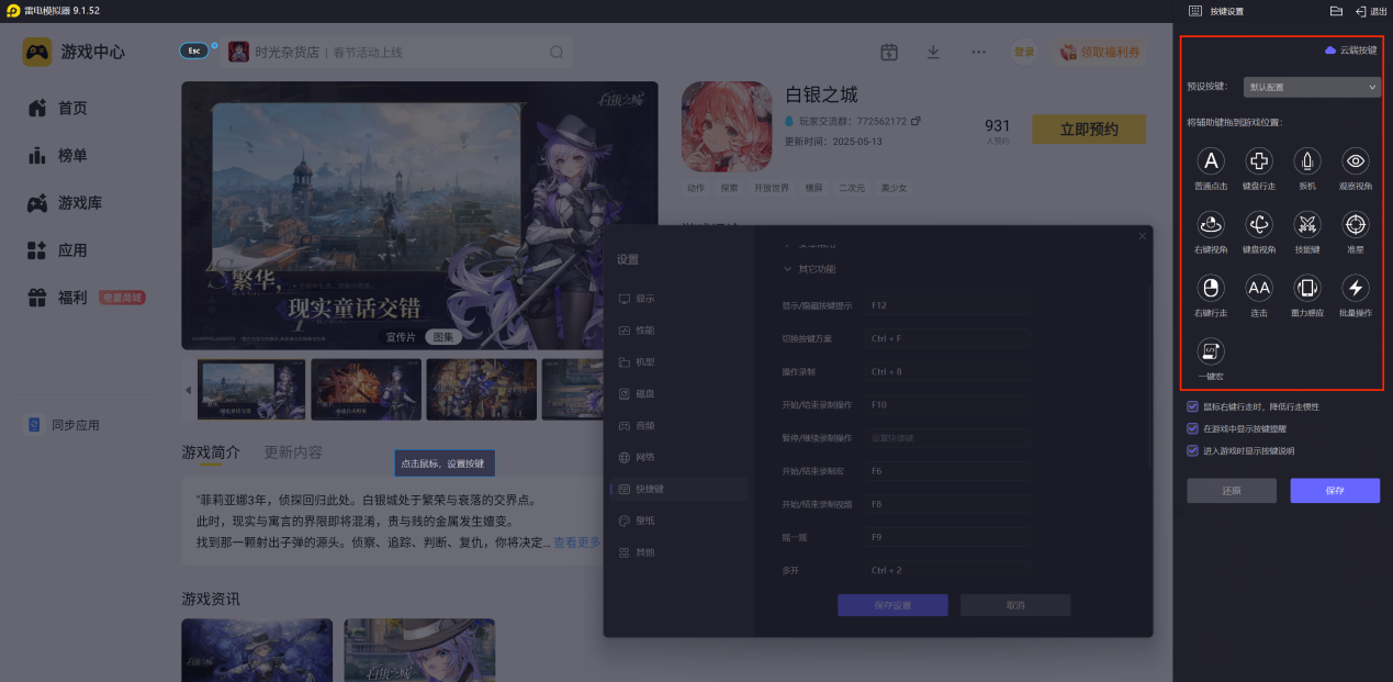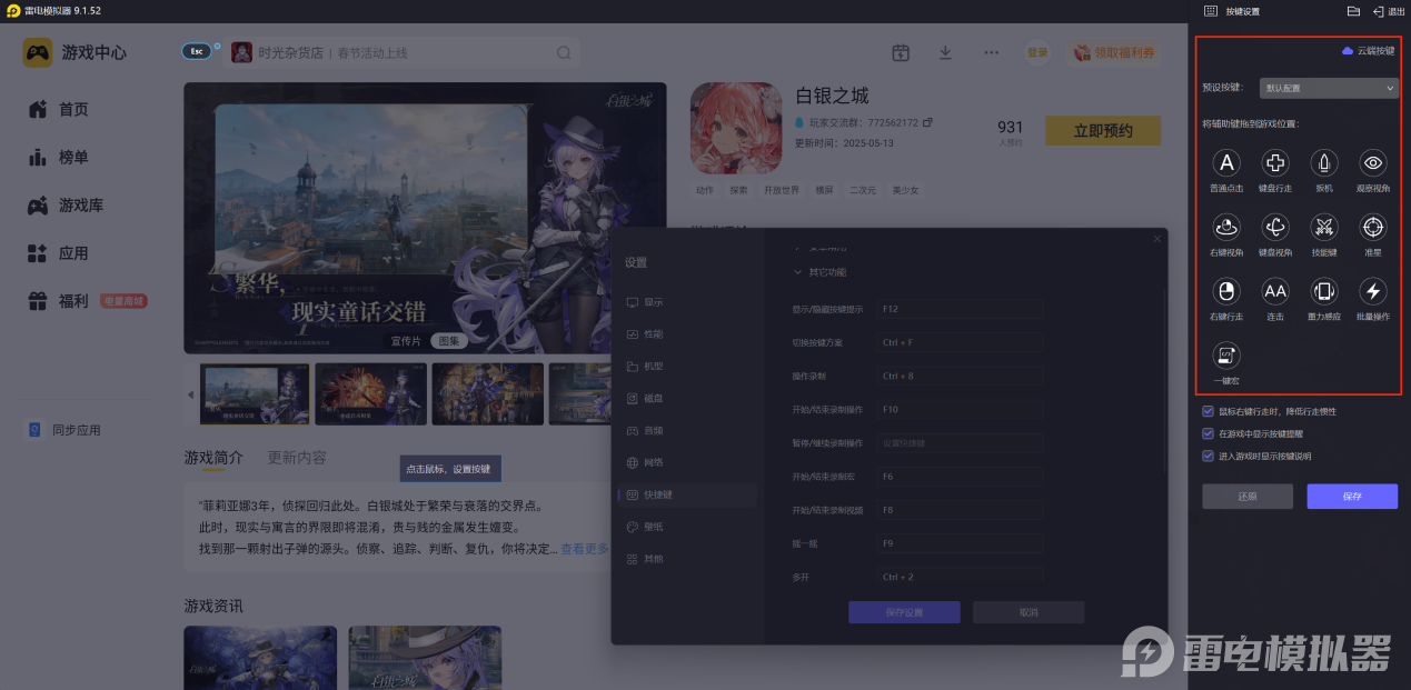 雷电模拟器支持自定义键盘映射,玩家可将游戏中的移动、技能释放、视角切换等操作绑定到键盘和鼠标,实现PC端“ WASD移动+鼠标瞄准”的精准操作,尤其适合白银之城中的战斗、解谜等需要快速反应的场景,操作效率远超手机触屏。