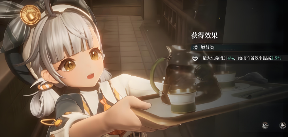 咖啡厅的每一款饮品都经过精心设计,提供明确的战斗数值增益,是出征前必做的关键准备。例如招牌的量筒浓缩咖啡,饮用后能直接提升全队成员4%的生命值上限,并显著加快终极技能的能量充能效率。