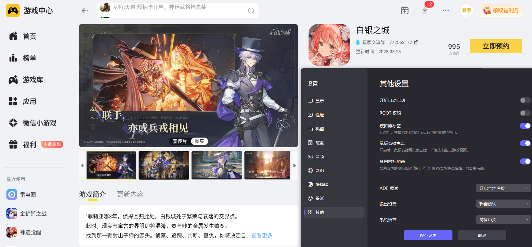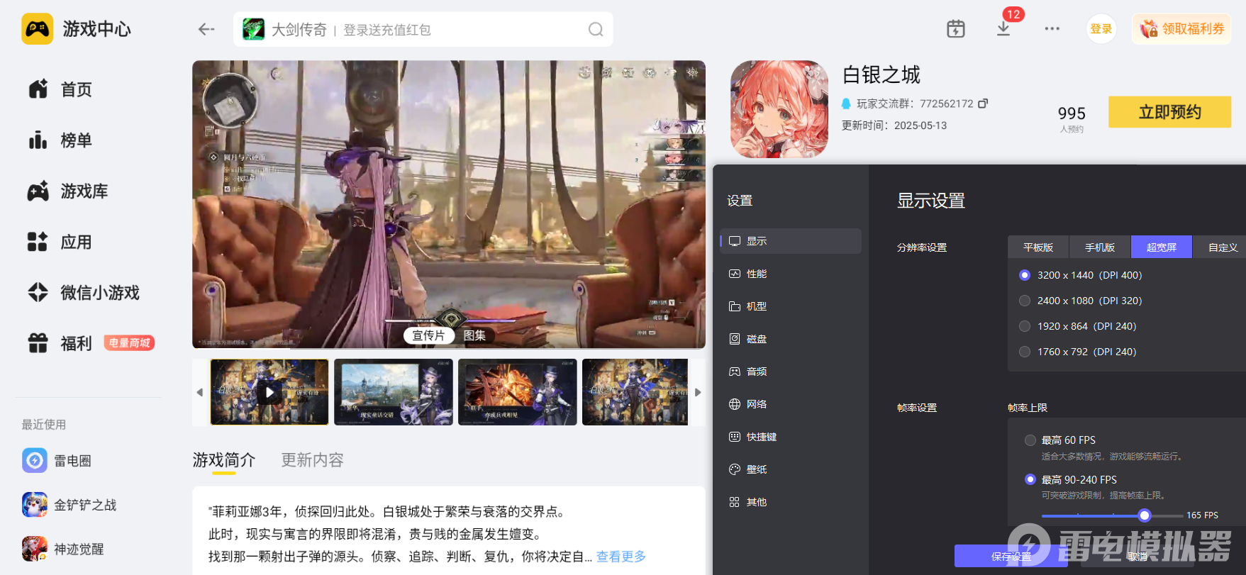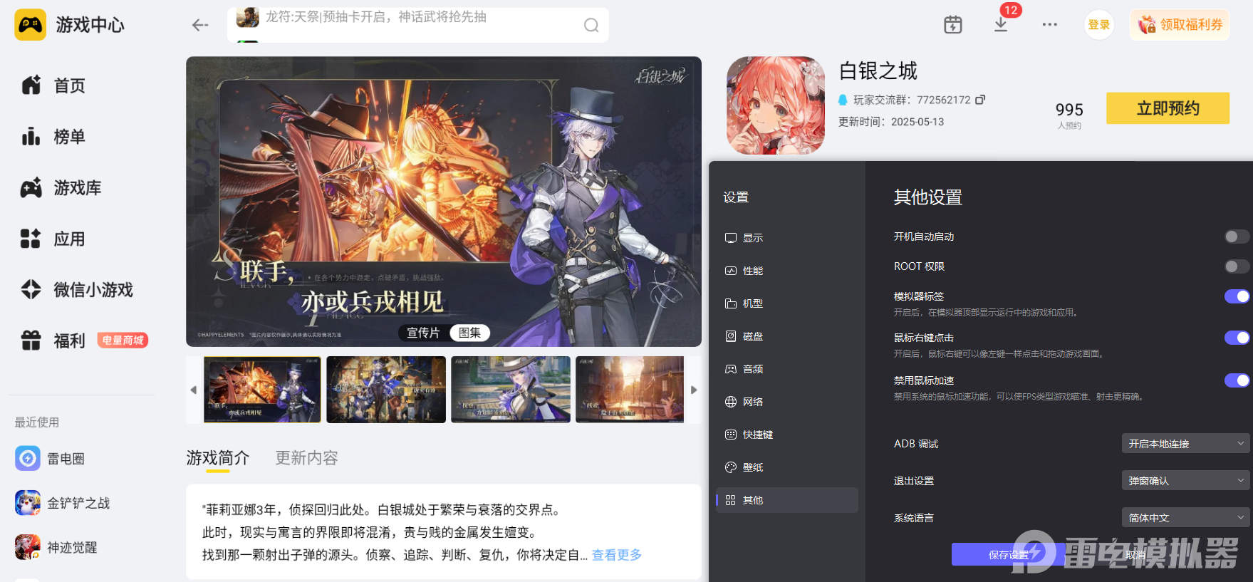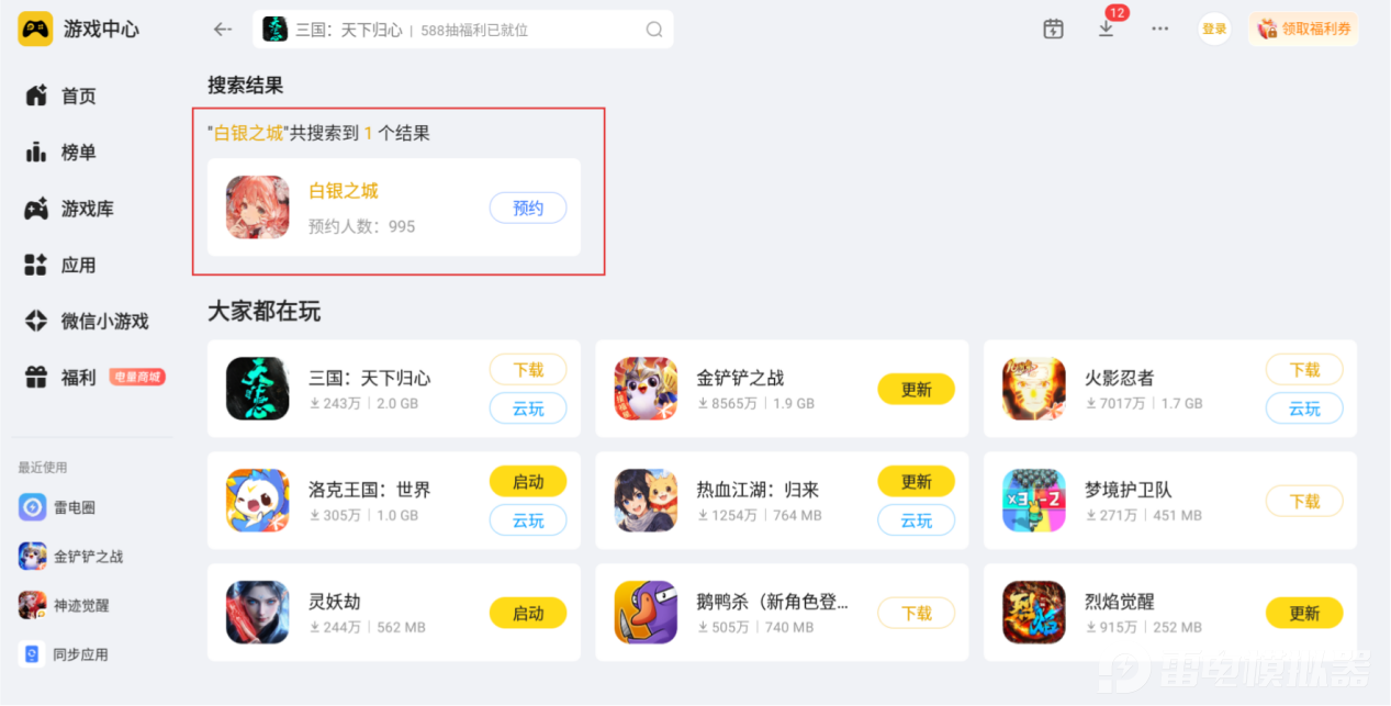 在这里,小编建议大家选用雷电模拟器在电脑上玩白银之城,整体游玩感受会得到全方位提升,全程游玩过程舒适又省心。