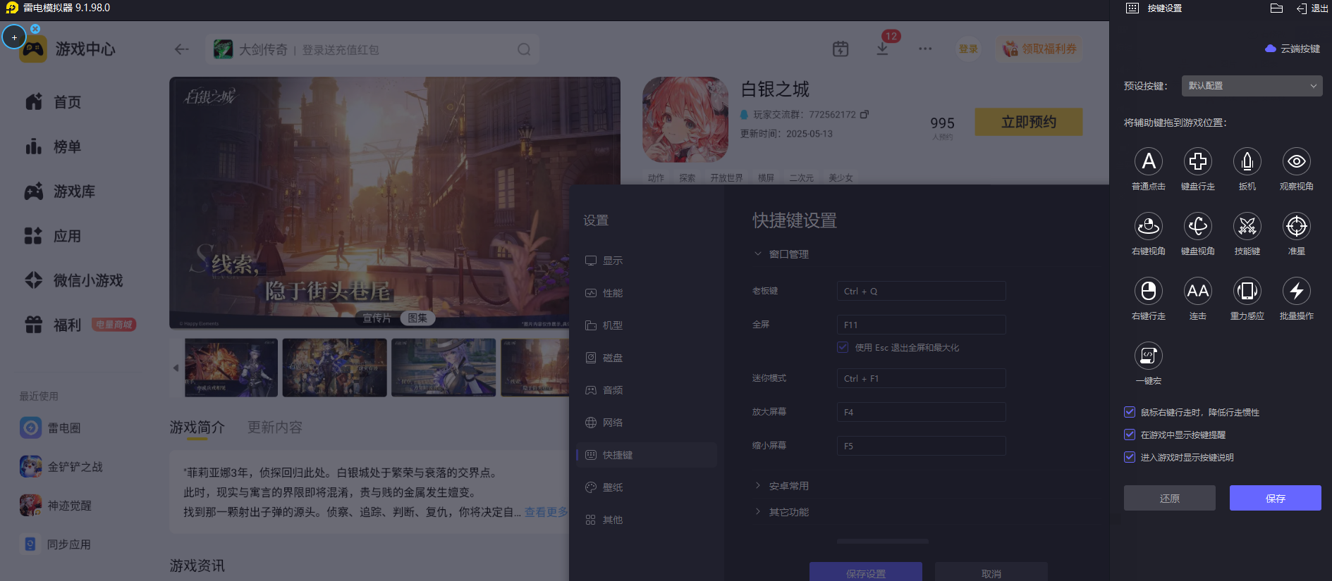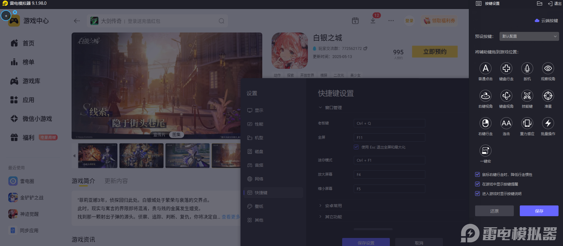 白银之城阵容连招释放和技能走位调整都需要精细操控,手机触屏按键面积小,很容易出现操作错位影响对战发挥。雷电模拟器支持自定义键鼠专属操作按键,适配游戏各类连招释放和走位操作需求,每一次技能释放和角色移动都能精准把控,打出连贯对战操作,轻松发挥出T0角色的全部实战战力优势。