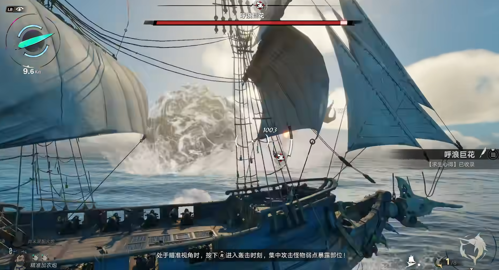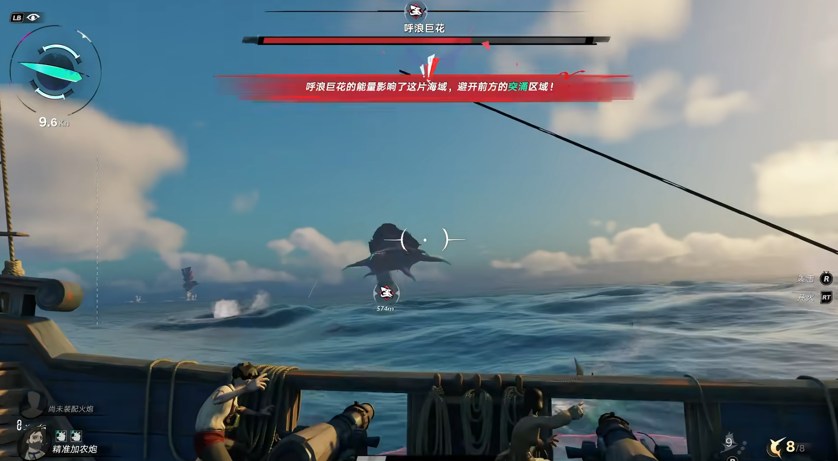 海战中靠近目标后,切换至战斗视角,加农炮会自动处于待发射状态。移动屏幕调整船身角度,对准目标后点击发射按钮即可开火。海怪有高亮显示的弱点,瞄准弱点攻击能造成更高伤害,比如攻击海怪的触手根部可削弱其行动能力。