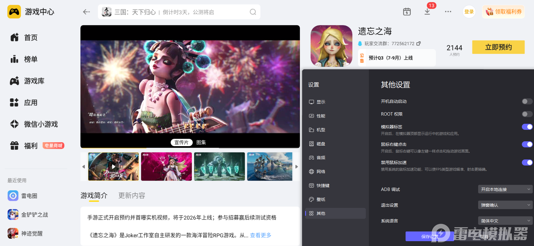 在这里,小编建议大家使用雷电模拟器在电脑上游玩遗忘之海,能够带来更为舒适的游戏体验,让整体的任务推进和战斗操作都变得更加轻松。