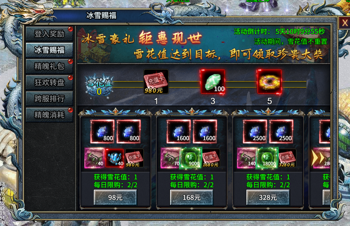 活动简介:精魄双倍狂欢计划!收集/消耗指定额度冰雪精魄,即可解锁多层冰雪宝藏,亿万灵符海量放送,超额福利拿到手软!