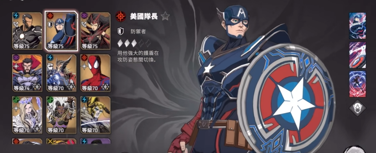 钢铁侠、美队和奇异博士;作为典型的均衡型阵容,三位角色分别占据输出、前排和辅助三个位置,容错率表现很高,其中钢铁侠可进行群体打击,美队拥有嘲讽拉仇恨的能力及多种效果,正面战斗力强,奇异博士作为辅助类型角色,能提供控制效果、全体恢复效果和附加魔法伤害,增强队伍的生存和输出。