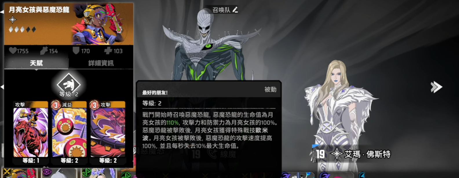 卡组里月亮女孩是核心辅助,放技能能召出恶魔恐龙,还能给全队充能,配上“梦境大冒险”神器攒资源更快;线魔是输出核心,召出仇恨之线能吸引火力,再戴个“宇宙魔方”活得更久,中后期伤害特别猛;恶魔恐龙是终极打手,签到第二天就能免费拿到,范围伤害超高,一出场就能清场。