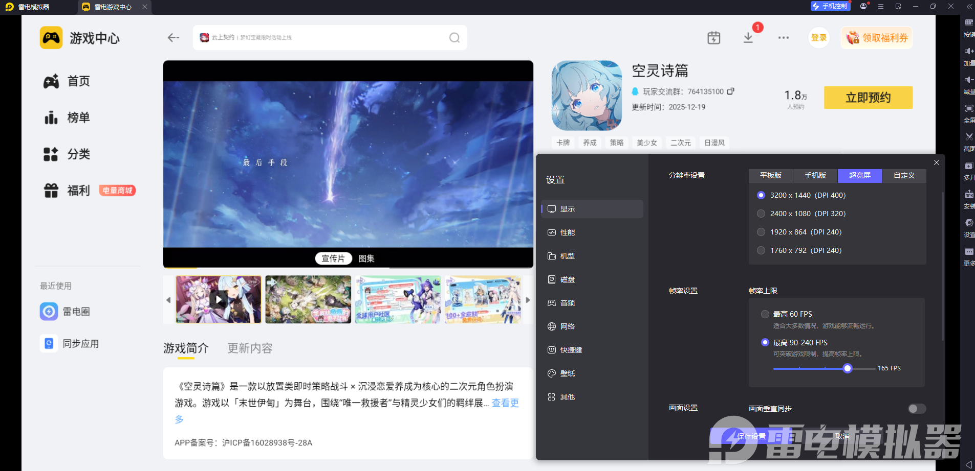 雷电模拟器支持4K分辨率和165稳定帧率运行,能清晰呈现《空灵诗篇》的建筑细节和任务图标。打工玩法中需要频繁查看建筑任务类型和精灵状态,模拟器的大屏显示让扭蛋任务标识、体力值提示等关键信息一目了然,不用费力盯着手机小屏幕,夜间翻倍任务的时段提示也能看得更清楚,避免错过高收益时段。