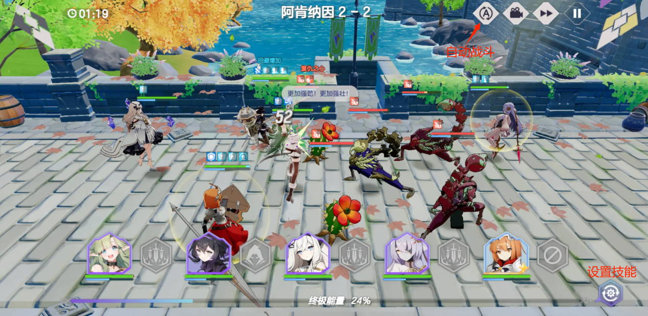 游戏是策略即时战斗模式,每次可以上场5名角色,战斗过程中大部分技能都会自动释放。在战斗界面下方有个能量条,蓄满后就能手动释放角色的终结技能。终结技伤害比普通技能高,且附带一些特殊效果,如群体控制或范围输出等。想要尝试角色技能衔接进行手动通关的话,就要合理把握释放技能的时机了。