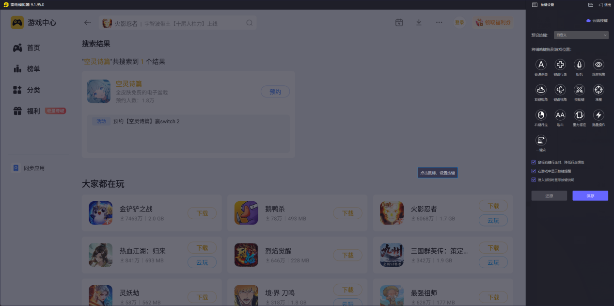 其次是精准的键鼠操控,游戏约会互动与剧情选择需频繁点击选项,移动端触屏易出现误触,尤其在限时选择场景中可能错失高好感选项。雷电模拟器可自定义键鼠按键,鼠标点击精准定位选项,键盘快捷键快速触发互动,无论是送礼时的道具选择,还是剧情中的分支决策,都能毫秒级响应,操作精度大幅提升。