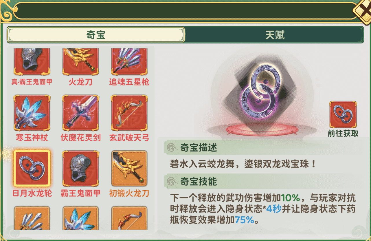 这个对刺客职业来说就有奇效了,众所周知刺客的武功释放频率很高,并且还有超必杀武功,如果在超必杀武功前使用奇宝技能,能够极大增加超必杀武功的伤害。