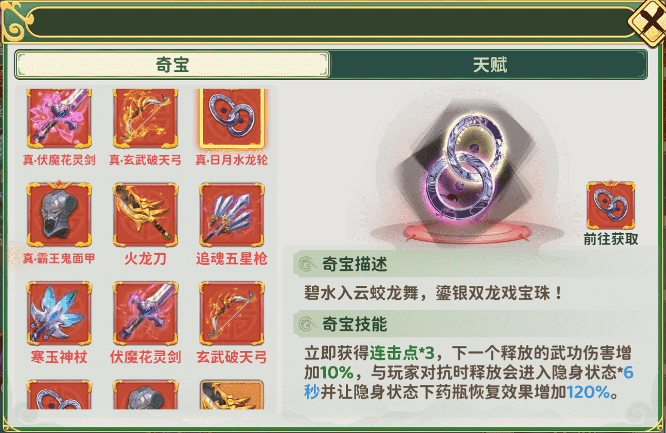 真日月水龙轮的技能效果是日月水龙轮的翻倍,并且和额外增加了释放奇宝技能后能够立刻获得连击点,可以大幅增加刺客的伤害。