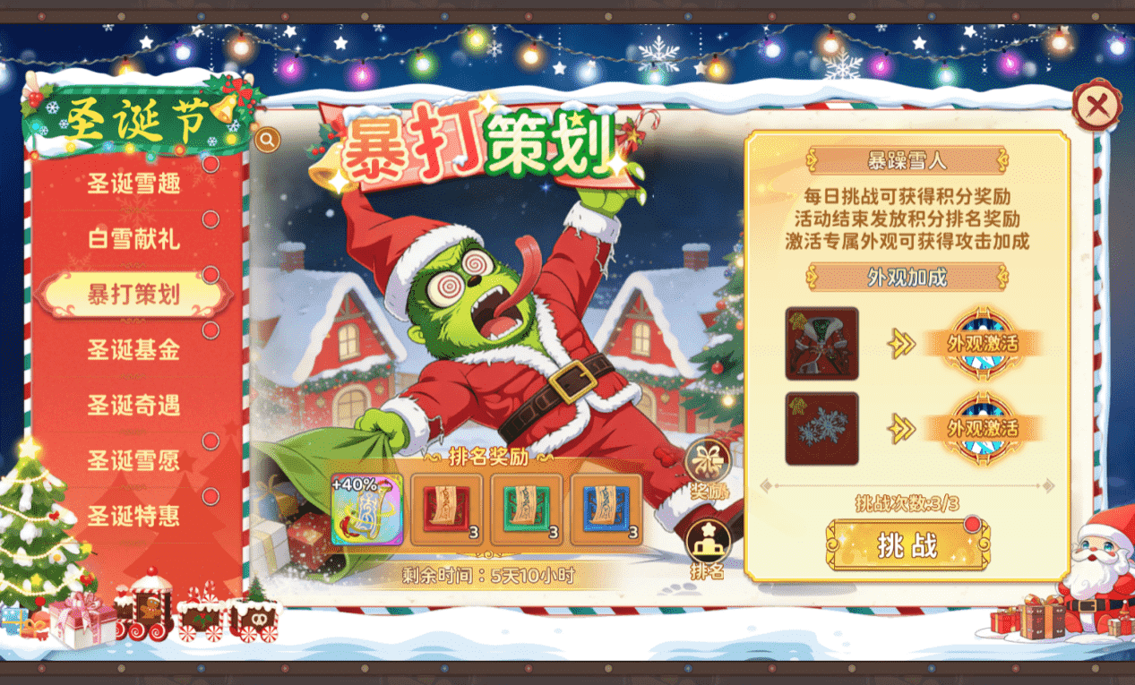 每日完成挑战即可获得积分奖励;活动结束后将根据积分排名发放丰厚奖励,穿上应景的「圣诞系列外观」,可以获得攻击加成哦!