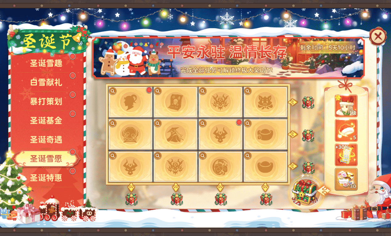 平安永驻,温情长存。 完成全部任务即可解锁终极大奖,圣诞系列外观、稀有道具等丰厚好礼,尽在囊中,等你来拿!