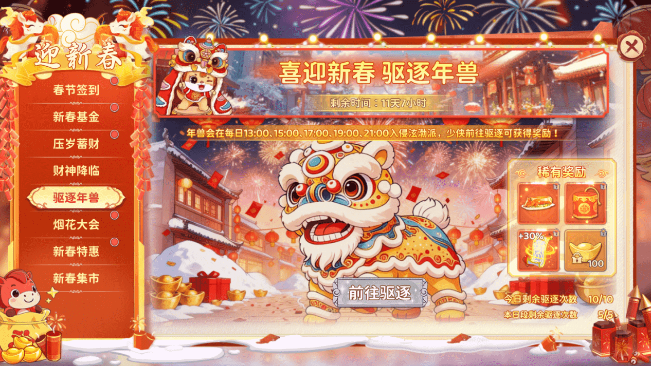 活动期间,年兽每日定时突袭泫渤派领地!少侠们需在限定时间内将其驱逐,伤害输出越高,奖励越丰厚!