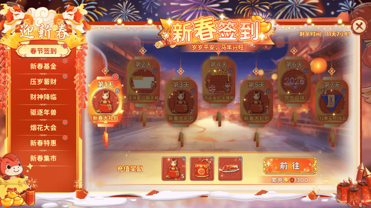 新春佳节,快来开启签到之旅,累计登录即可获赠新春大礼包,充值元宝更可额外领取丰厚奖励!