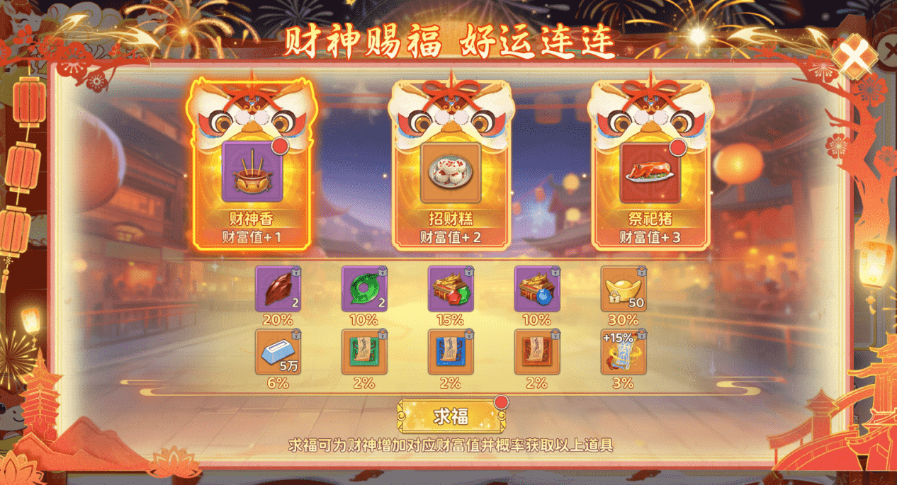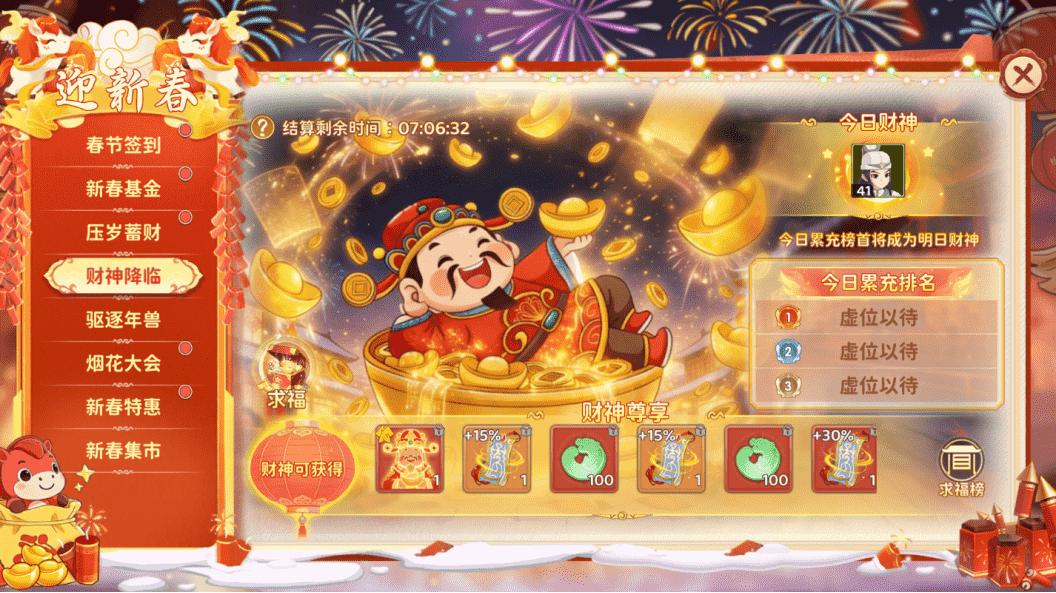 财神赐福好运爆棚!累充榜首成次日财神,赢尊享豪礼。众少侠可捐献福袋求财,助财神攒财富值,共闯财富江湖!