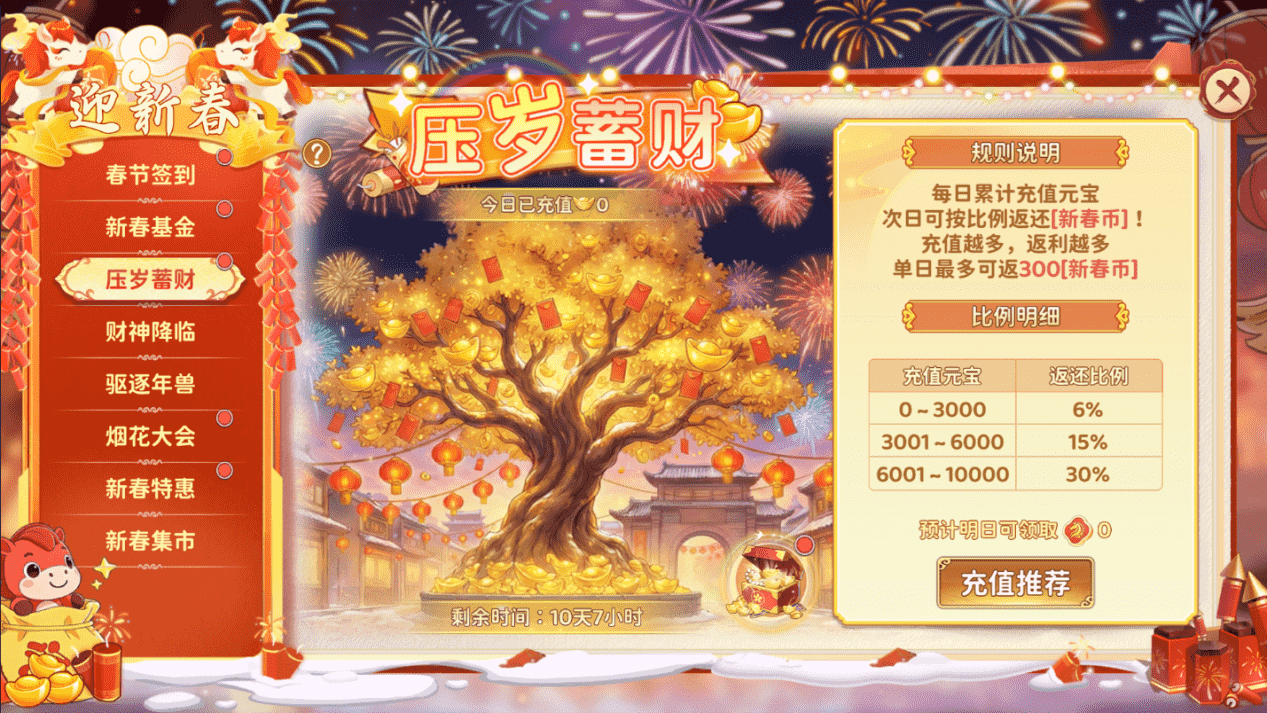 每日累计充值元宝,次日按比例返还新春币,充值越多返利比例越高!