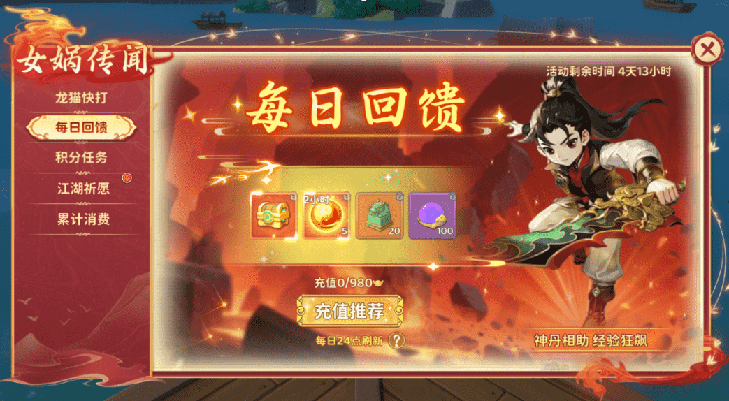 活动期间每日充值元宝达指定额度即可获得偃甲宝箱和披风洗炼材料,还有神丹相助,机会难得,快来参与吧!