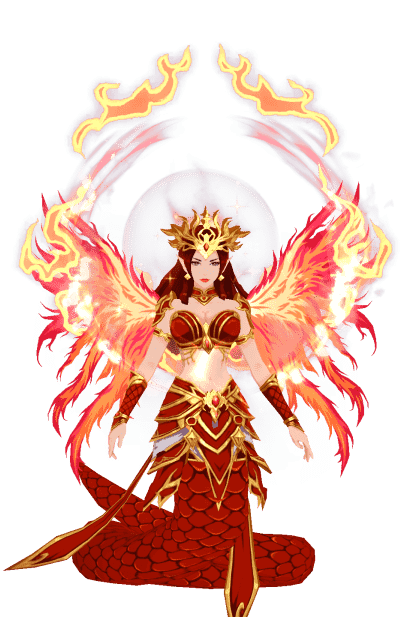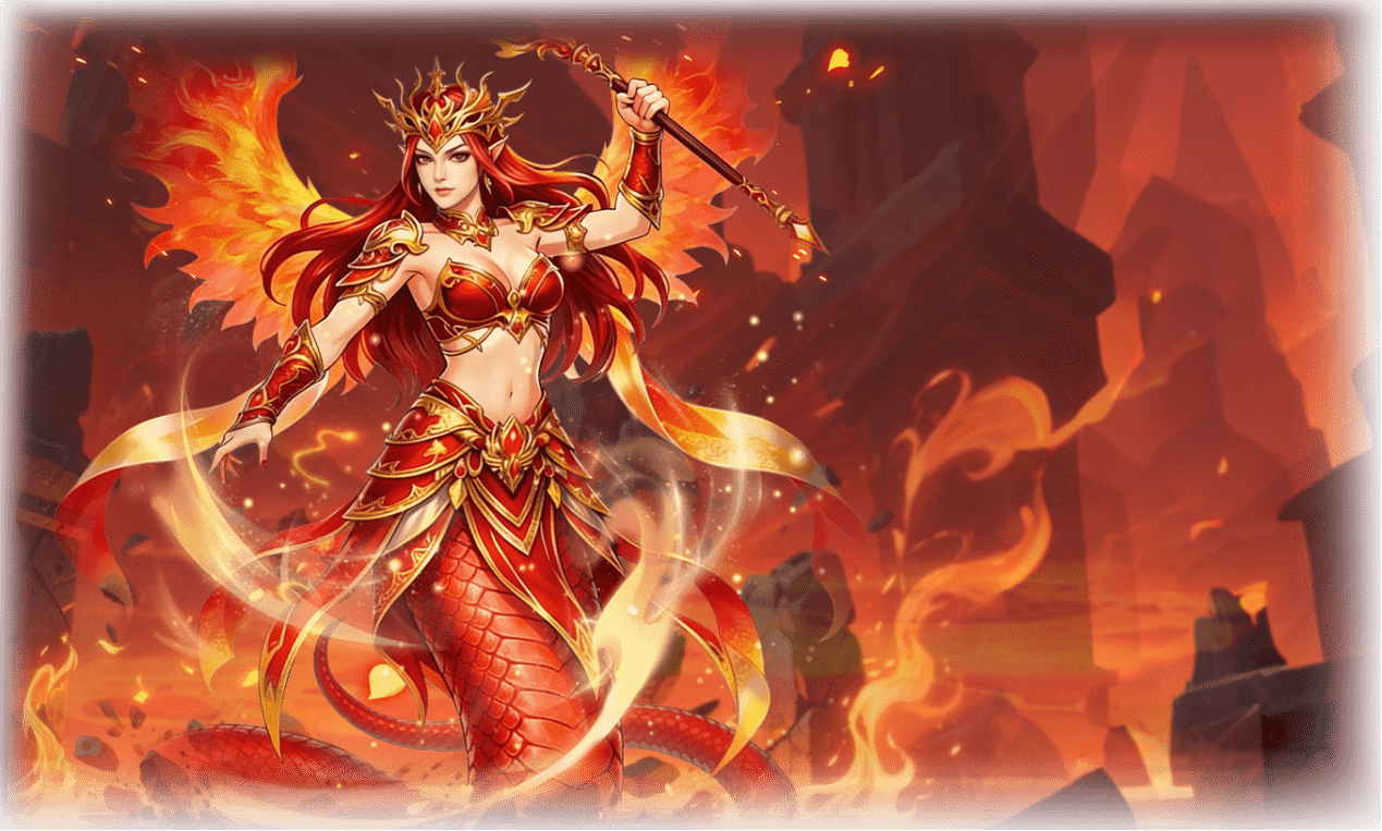 「绯鳞妖后」以火焰为伴,红发如烈焰翻涌,身后火焰似凤凰羽翼,下身是覆着红鳞的蛇尾,金红战甲衬得身姿飒爽,兼具创世的慈悲与护世的威严,补天的神力仿佛透过火焰倾泻,守护着世间安宁。