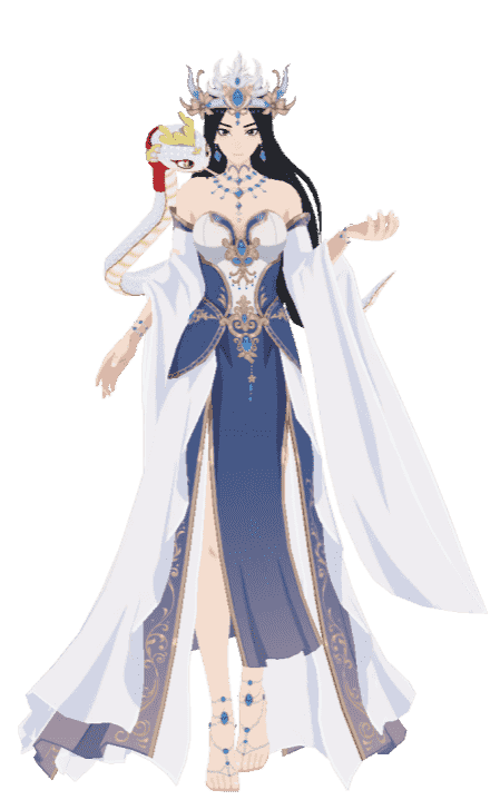 「青月仙子」头戴嵌宝镶玉华丽冠冕,流苏垂落间自带仙气。身着蓝白相间的华服,深蓝抹胸绣着繁复金纹,衣袂翻飞如云似雾。乌黑长发垂落肩头,颈间腕上珠饰轻晃,周身圣洁威严,尽显古典神话中仙子的清雅华贵。