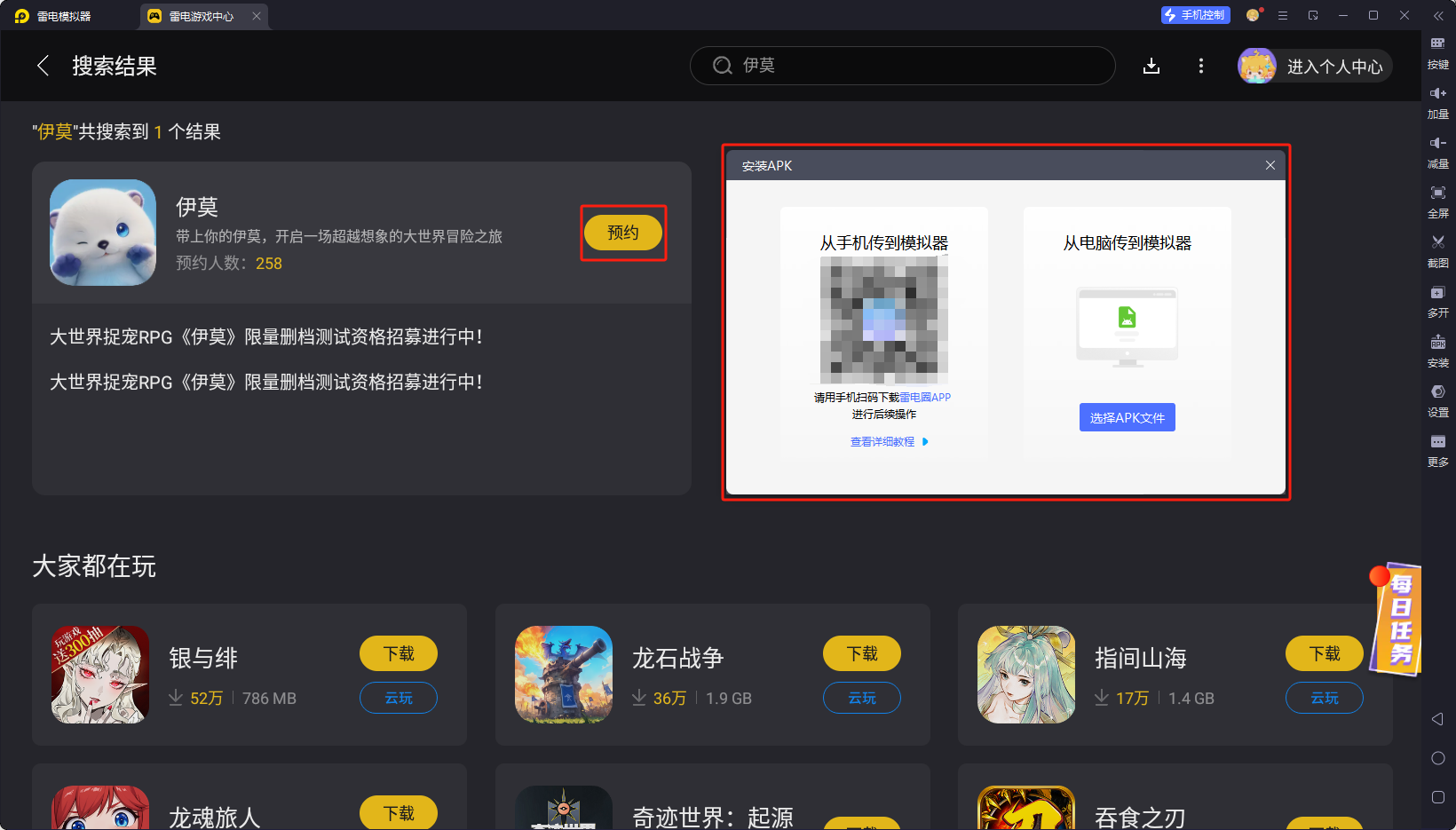 启动模拟器 → 打开游戏中心 → 搜索伊莫→ 点击预约,游戏上线即可安装。